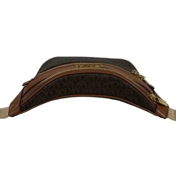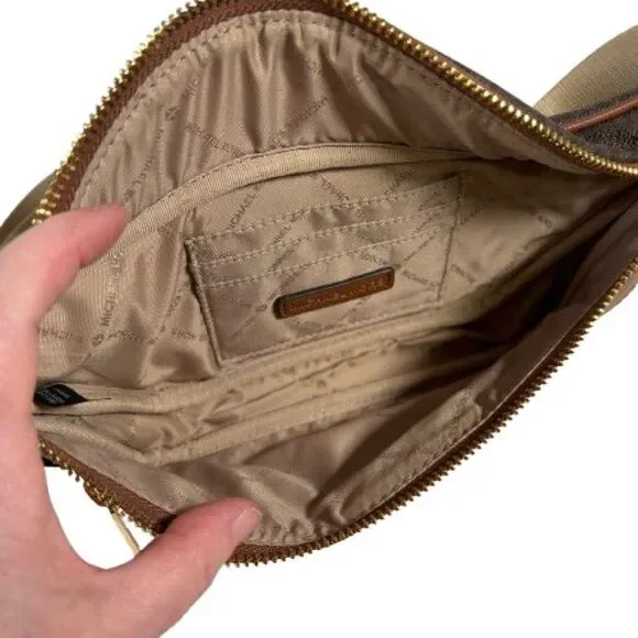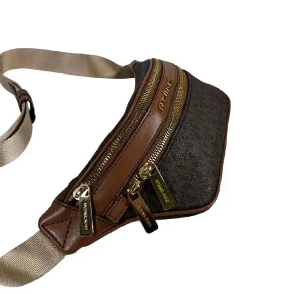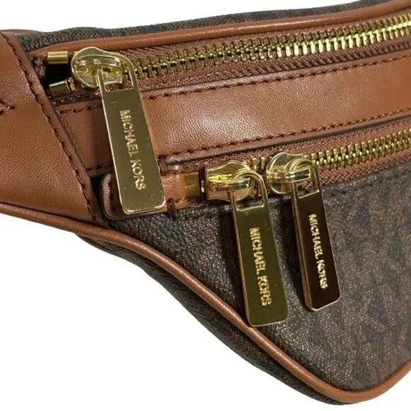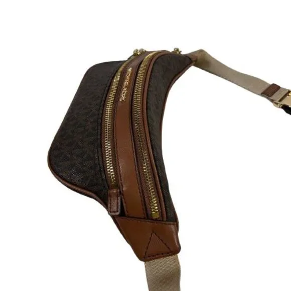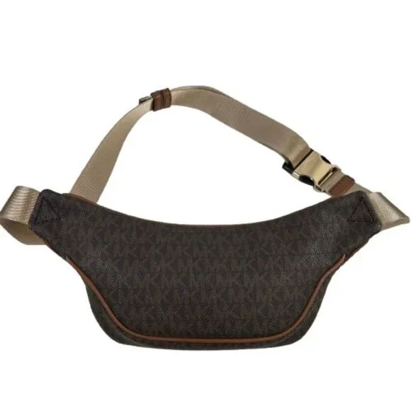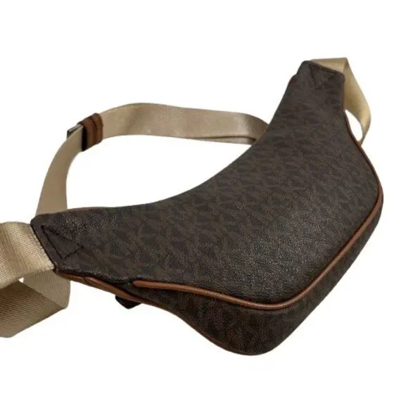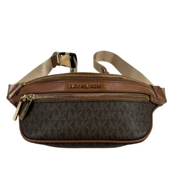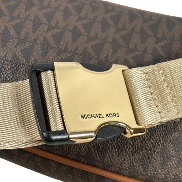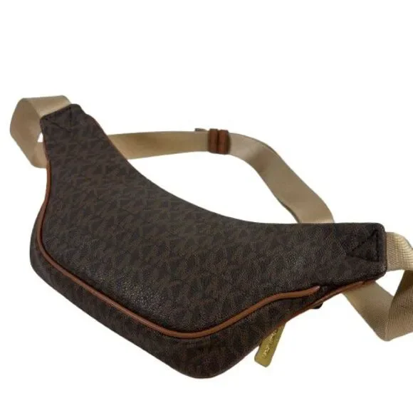 MICHAEL KORS KENLY SMALL WAIST FANNY PACK CROSSBODY BAGPVC LEATHERMK SIGNATURE100% AuthenticRetail: $398.00 Plus TaxMichael Kors Logo on Front1 Exterior Double Zip Pocket on FrontZip Top Closure with Full Length CompartmentGold Toned HardwareFabric Lining3 Credit Card Slots14"(Top) 7"(Bottom) (L) X 4.5"(H) X 2"(D)Strap: 44" (Adjustable)Check out our huge selection of thrifted treasures - bundle your purchases and save on combined shipping!We show pictures of every possible angle and include measurements in all listings. Please examine all pictures and description. If we overlooked something, or you need clarification on something, please ask questions prior to purchase.