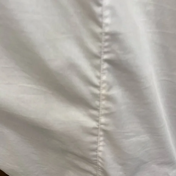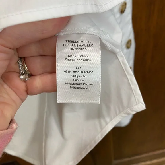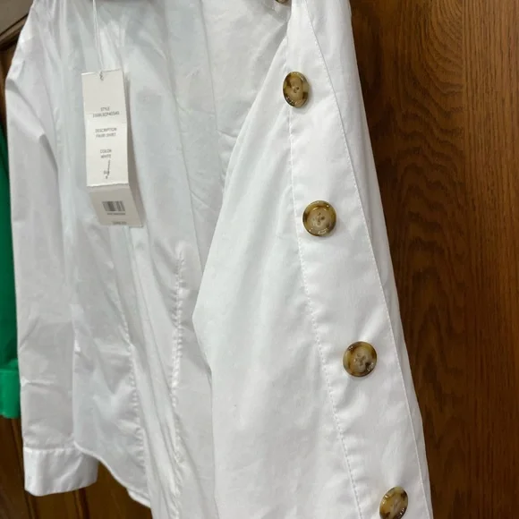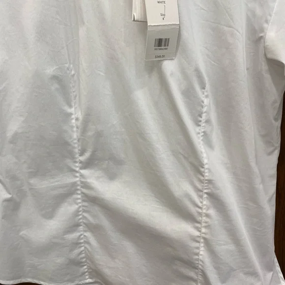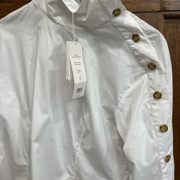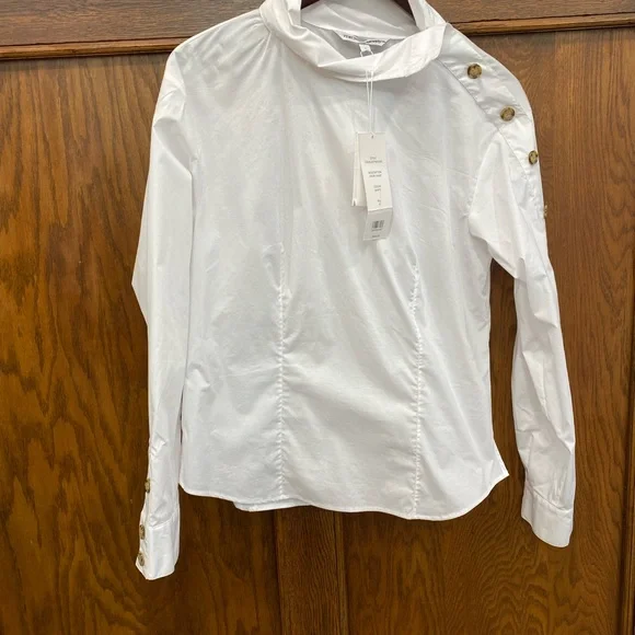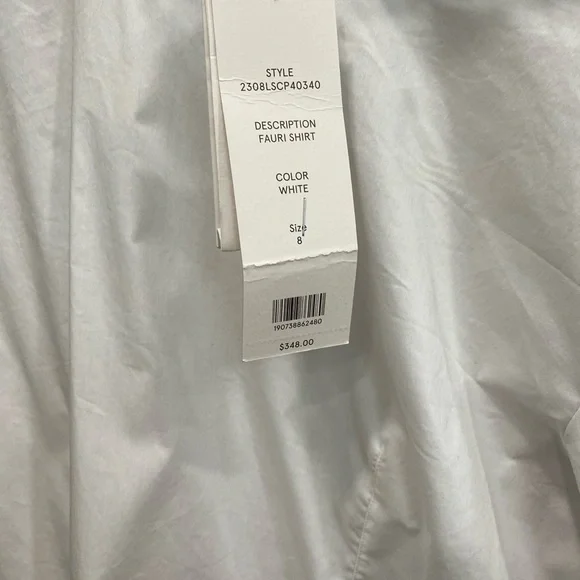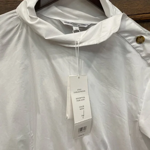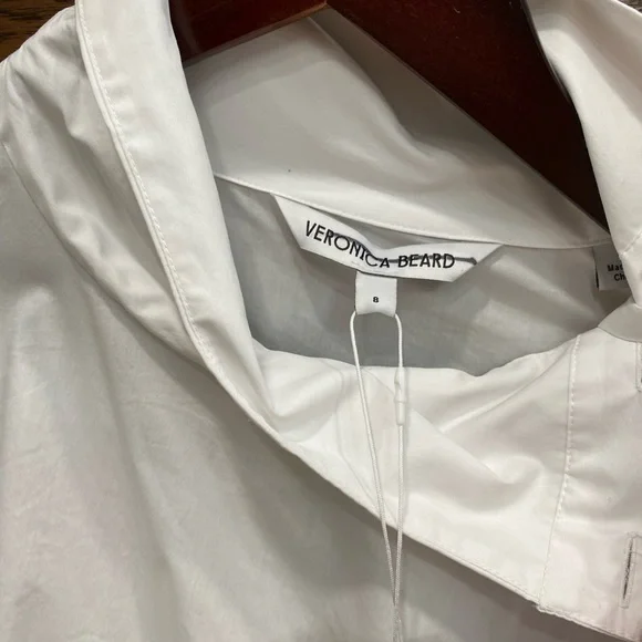 Cross out on brand. Shirt could use a cleaning and a press.Veronica Beard's sculptural Fauri cotton-blend shirt showcases tortoiseshell buttons along the sleeves and a foldover collar.Foldover funnel neckDrop shouldersLong sleeves, button cuffs67% cotton/30% polyamide/3% spandexMachine washImportedSIZE & FITAbout 25" from shoulder to hemModel measurements: 5'10" tallModel is wearing a US size 4