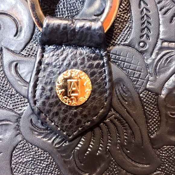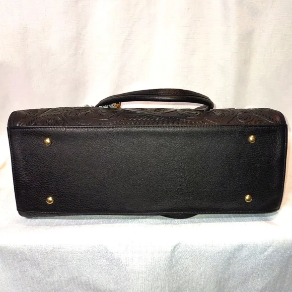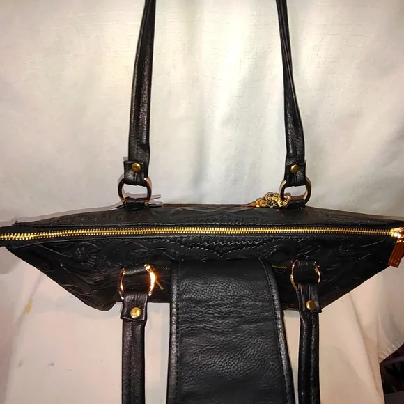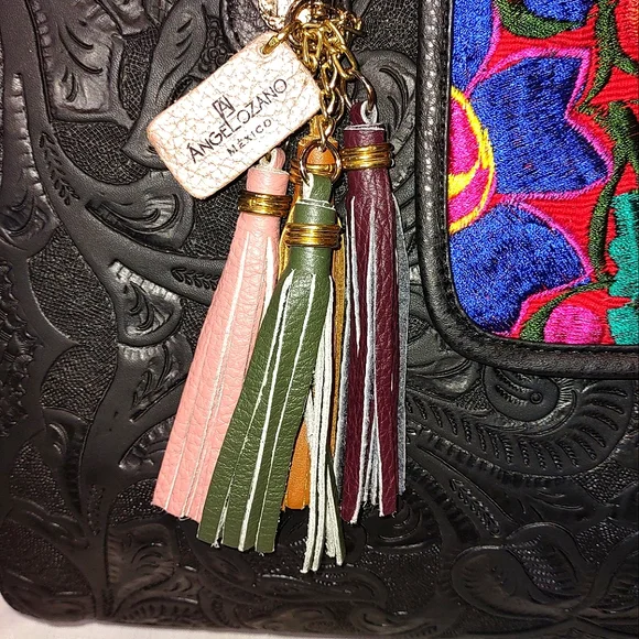 Brand new w/Tags!AngeLozano Chisel Engraved Black leather Tote with Floral Loom work !Premier Mexican designer Angelozano produces bags that are hand made and support fair trade artisans.The artisans express their emotions and feelings in the looms, and when we see them, they transmit to us a part of their life, their environment and their culture, that is why ALL THE LOOMS ARE DIFFERENT just as our personality is unique. By using this original bag you are carrying a unique and unrepeatable work of art created by Mayan hands and with the support of an internationally recognized 100% Mexican brand that makes sure to work under the "fair trade" scheme because we love what is well done in Mexico. .Hand Chiseled Black leatherHandcrafted embroidered loomGold plated hardware will not rust in humid climatesGold-colored reinforced metal hardware.Printed textile liningInterior zippered pocket and two multipurpose pocketsExterior zip pocketProtective metal feetDust bag and handmade keychain includedMeasurements: 14.75"W x 10.5"H x 6.25"DDual Handles w/ 10" dropSO lightweight and elegant! the pictures don't do this one of a kind bag justice! This is a show piece!!Makes a great gift!