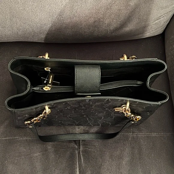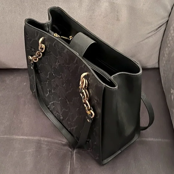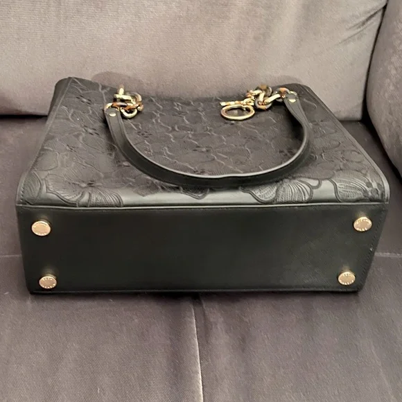 Authentic brand new with tagsMeasures approx. 12” W x 10” H x 5.5” DSaffiano LeatherFloral embroidery on front sidePlain back sideMagnetic snap top closureGold tone and acetate rings hardwareDual chain link and leather top handles with approx. 10.5” dropFlat bottom with protective metal feetInterior features: 1 center zip compartment diving 2 open compartments1 zip pocket1 cell phone pocket5 multi function slip pockets