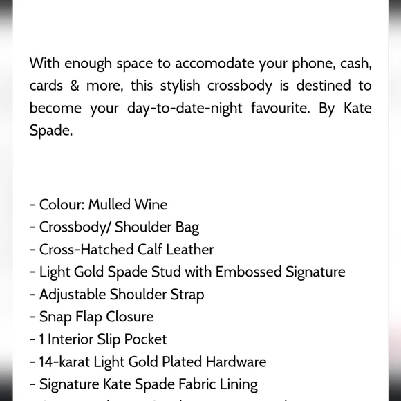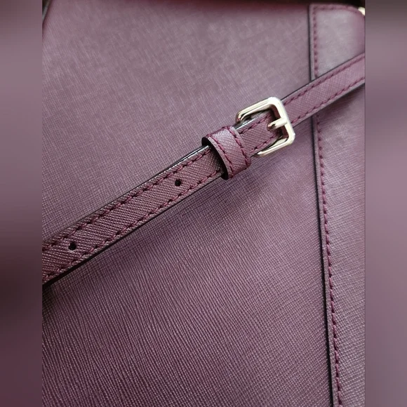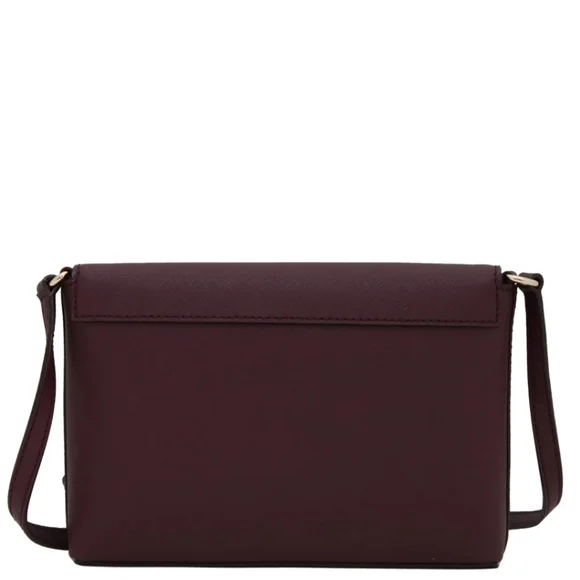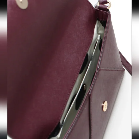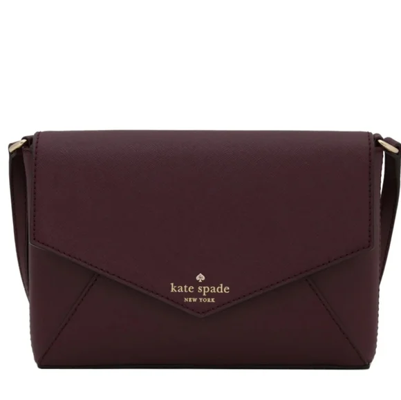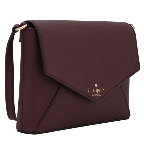 This Kate Spade Cedar Street Monday Envelope Handbag is a small wine-colored crossbody purse with a textured finish. It features a catch fastener closure, a crossbody strap handle in wine color, and gold hardware. The interior lining is cream with black polka dots. The bag is designed for various occasions like travel, wedding, parties, or casual outings. It is lightweight and made of leather with rayon fabric, suitable for women looking for a stylish and practical accessory.