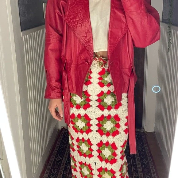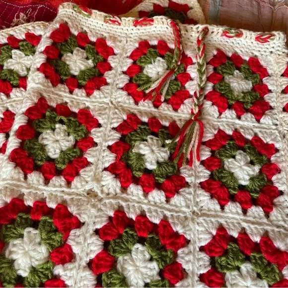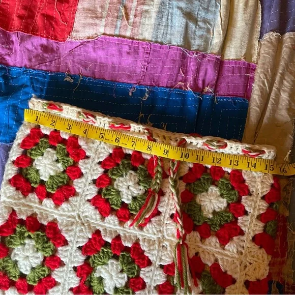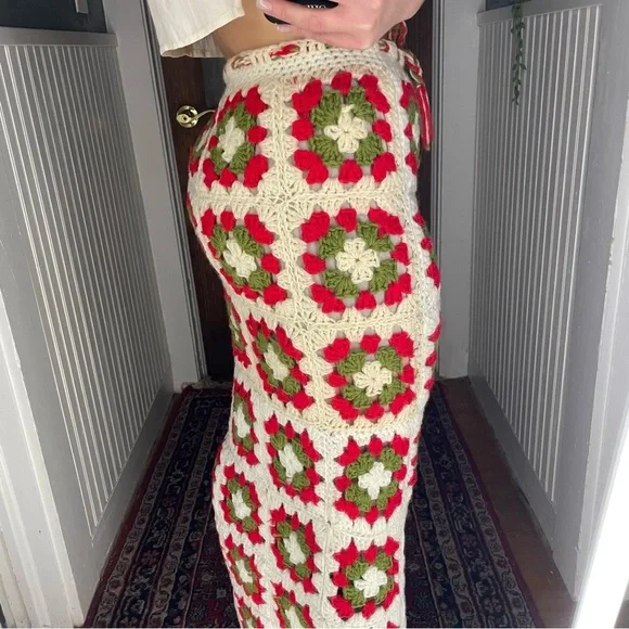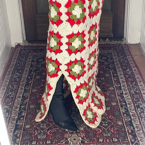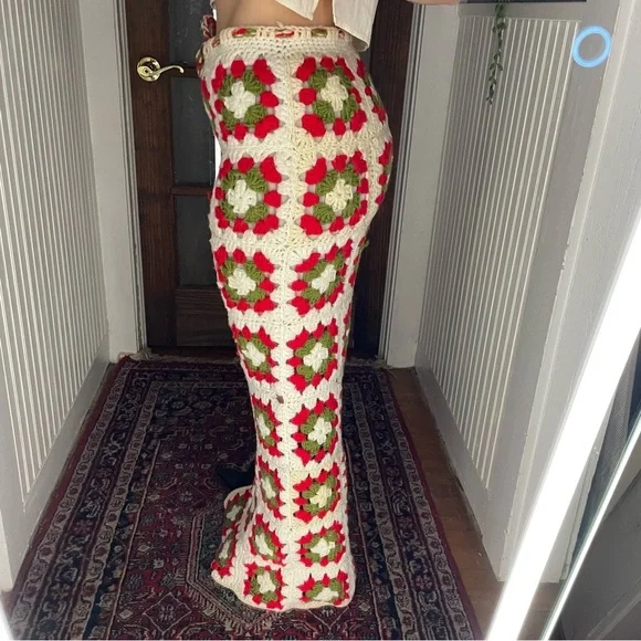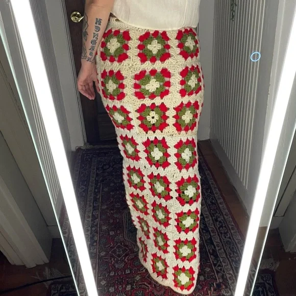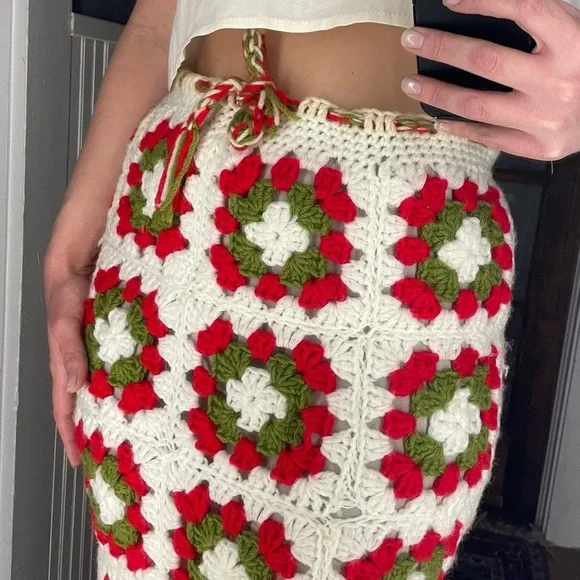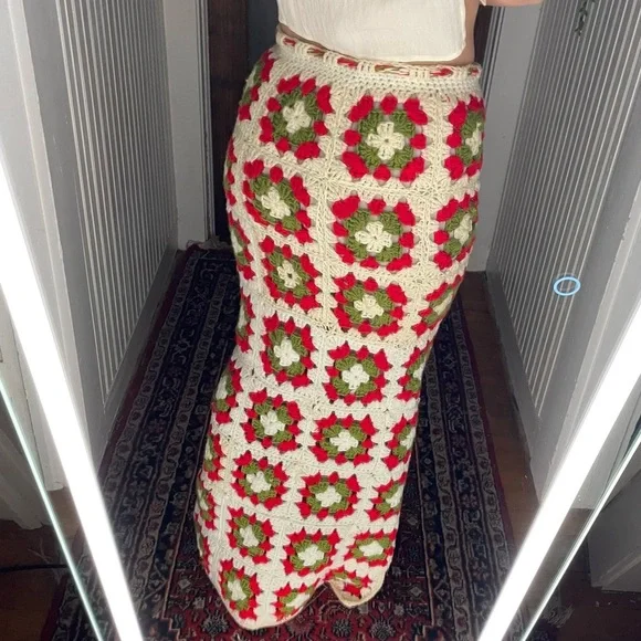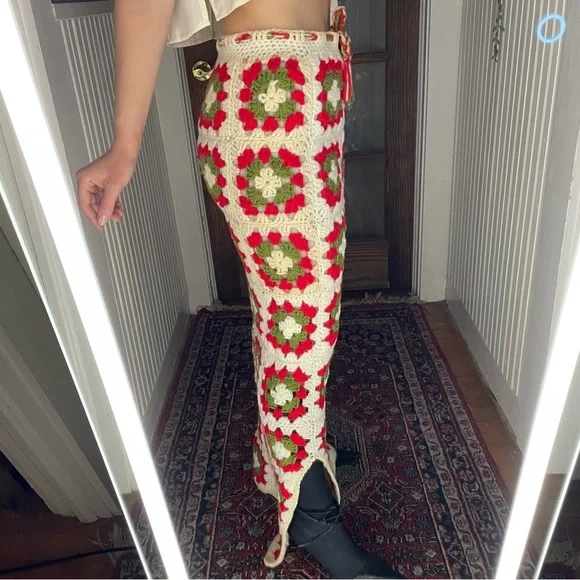 Stunning on Drawstring works - sizes can vary Length of skirt 44”Waist measures at 15”Small blemishes are photographed- three of the knitted holes are a little large than the others, not terribly noticeable This skirt has so much more life left in it ✨Beautiful slit detailing Two toned creams + red + green colors