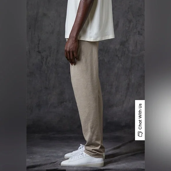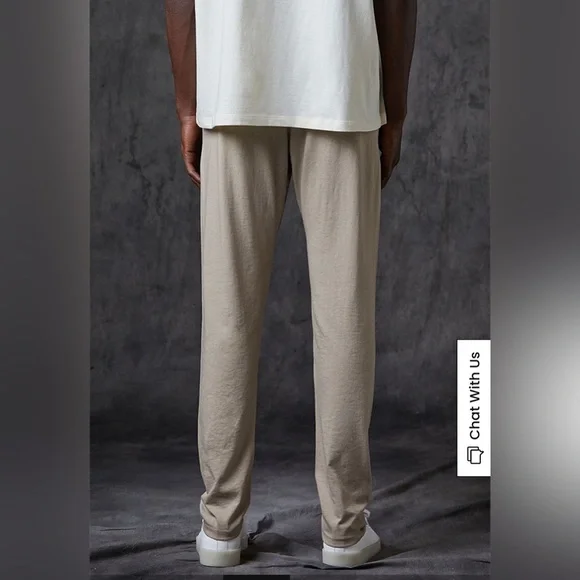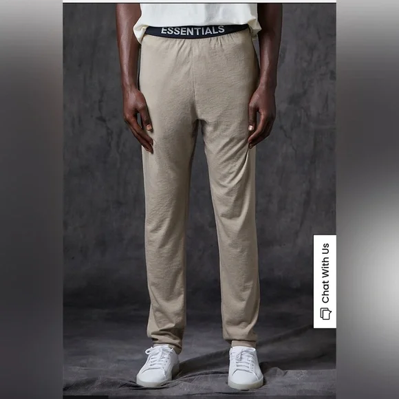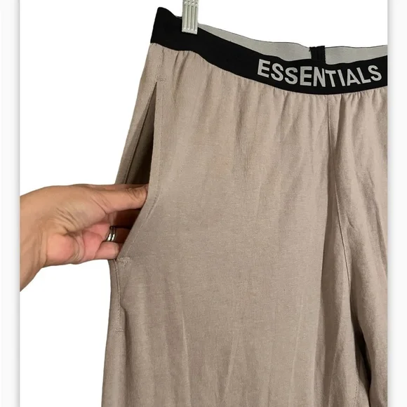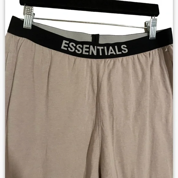 Fear of God Essentials Essentials Tan Lounge PantsSize MThe FOG Essentials Tan Lounge Pants feature a relaxed fit and elasticized logo waistband withESSENTIALS branding.• Solid color lounge pants• Side seam pockets• Branded elasticized waistband• Relaxed fit• Model is wearing a size medium• Model measurements: 6'1" height, 30" waist, 32 inseam• 53% cotton, 40% polyester, 7% rayon tri-blend• Hand wash, flat or line dryGood Preowned condition