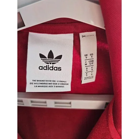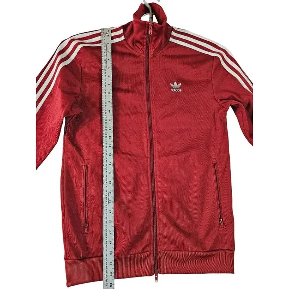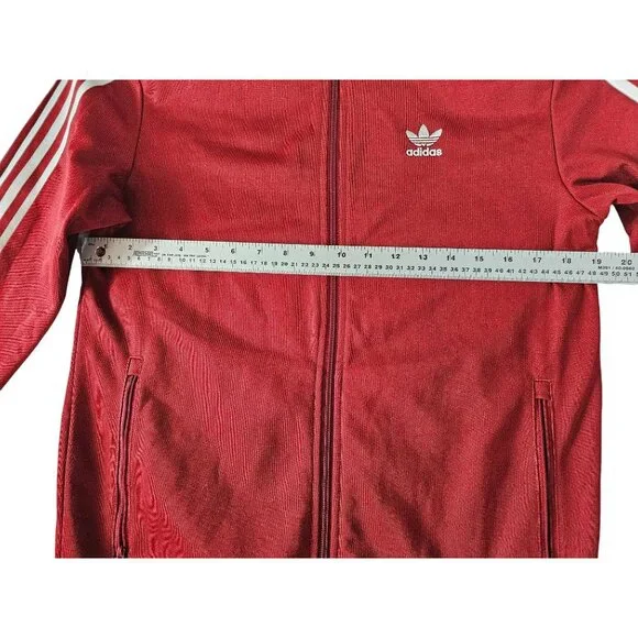 **Title:** Adidas Originals Beckenbauer Track Jacket Rust Red Men's Sz S - Excellent Condition**Product Description** This Adidas Originals Beckenbauer Track Jacket in rust red is a classic piece of sportswear with a timeless design. Made from a comfortable and durable blend of 70% polyester and 30% cotton, it's perfect for casual wear or adding a retro touch to your athletic style.**Details:*** **Brand:** Adidas Originals* **Style:** Beckenbauer Track Jacket* **Size:** Small* **Color:** Rust Red* **Condition:** Excellent (No visible signs of wear or damage)* **Material:** 70% Polyester, 30% Cotton**Measurements (Laid Flat):** * Chest (pit to pit): 19 inches (48 cm)* Length (front, shoulder to hem): 27.5 inches (70 cm)* Shoulders (seam to seam): 16.5 inches (42 cm)* Sleeve Length (shoulder seam to cuff): 32.5 inches (83 cm)**Features:*** Embroidered Trefoil logo on chest* Raglan sleeves with piping* Elastic waistband on cuffs* Full zip neck* Contrasting 3-Stripes on sides* Two side zippered pockets* Regular fit**Additional Notes:*** All items have been cleaned and are from a smoke-free home.* Colors may vary slightly due to differences in monitor settings and lighting conditions.* Please refer to the photos and provided measurements for an accurate assessment of the jacket's fit and condition.**Keywords:** Adidas, Originals, Beckenbauer, track jacket, rust red, men's, size S, 70% polyester, 30% cotton, excellent condition, trefoil logo,