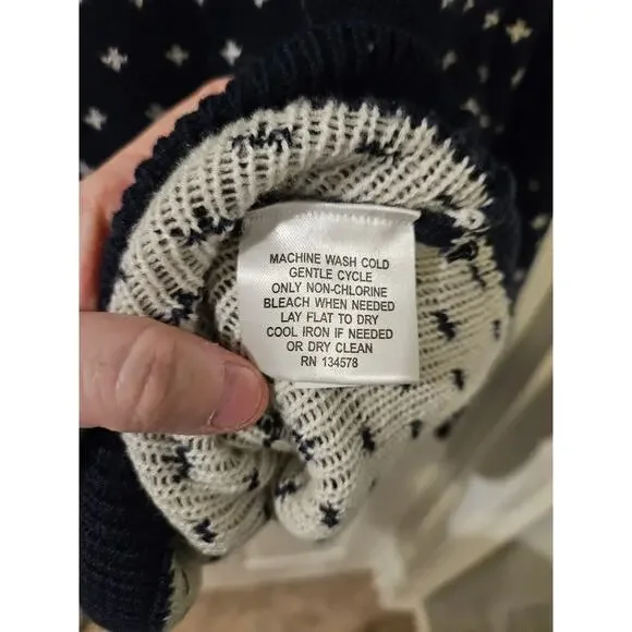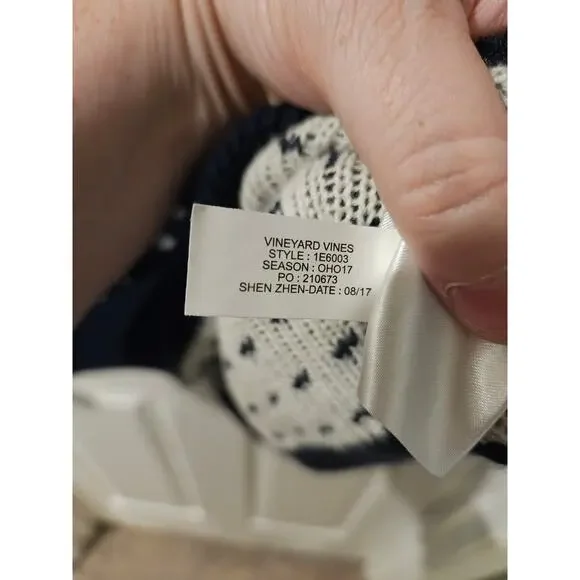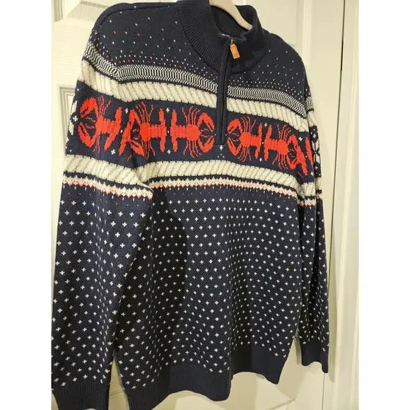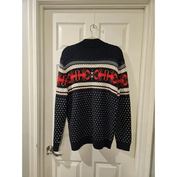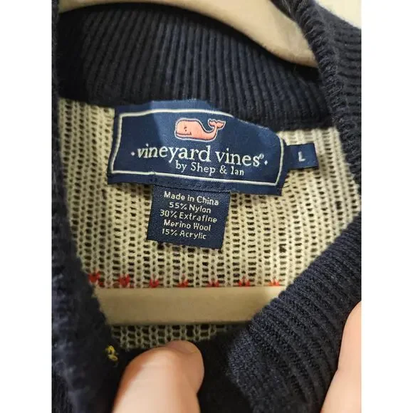 Men's Vineyard Vines quarter zip pullover sweater• Iconic lobster & Fair Isle pattern in navy, cream, and red• Size: Large – pit to pit 25”, length 31”• Material: 55% nylon, 30% extra fine merino wool, 15% acrylic• Style code: 1E6003• Ribbed mock neck, cuffs, and hem• Machine washable – cold gentle cycle, lay flat to dry• In excellent used condition – like new, no visible wear• Extremely soft and cozy feel – perfect for chilly coastal nights• Ideal for New England style, holiday parties, or summer clambakesKeywords/Styling:coastal prep, lobster print, Cape Cod style, nautical vibes, dad sweater, Maine lobster, preppy, holiday sweater, statement knit, fisherman style, lobster fair isle, nautical sweater, coastal grandma, lobster party, mens winter sweater, warm pullover, east coast prep, chunky knit, lobster motif, Vineyard Vines holiday, lobster lover gift, lobster fisherman sweater, beach house wardrobe, festive knitwear, seaside vacation style