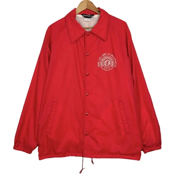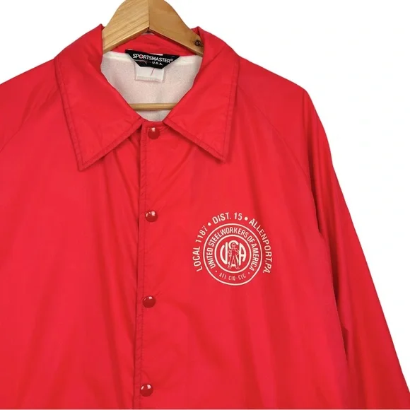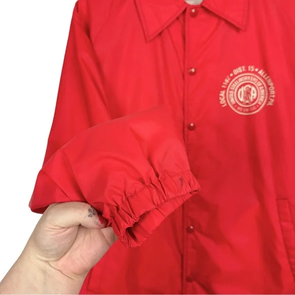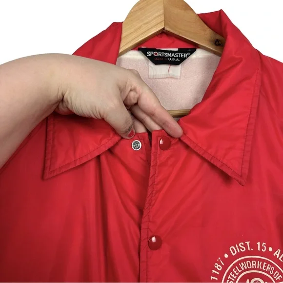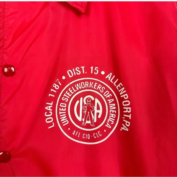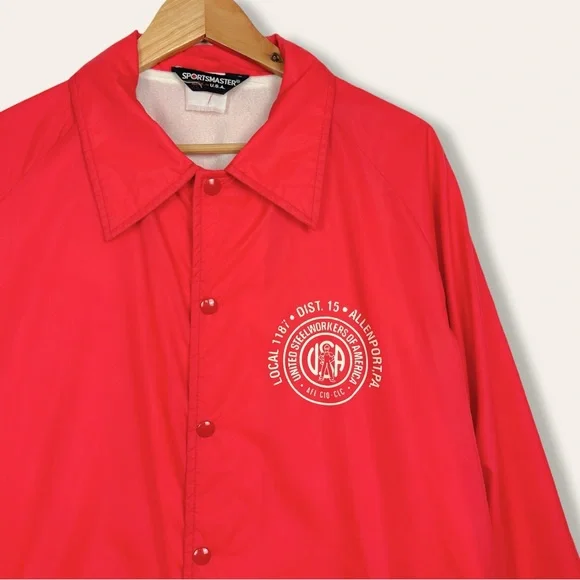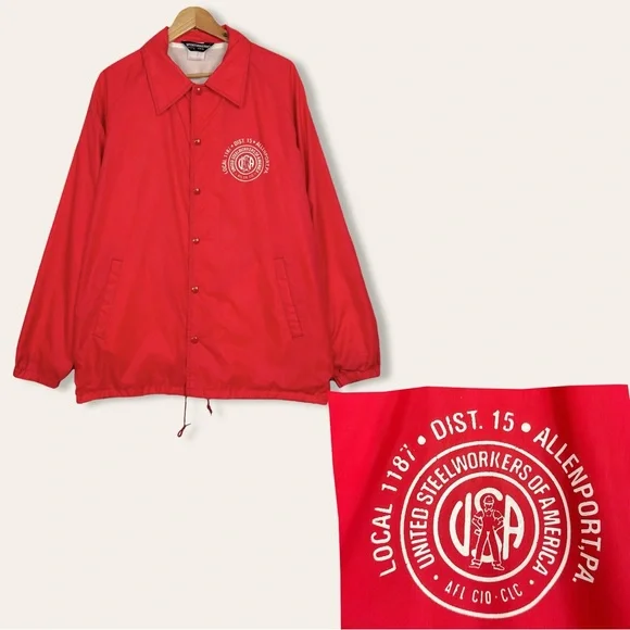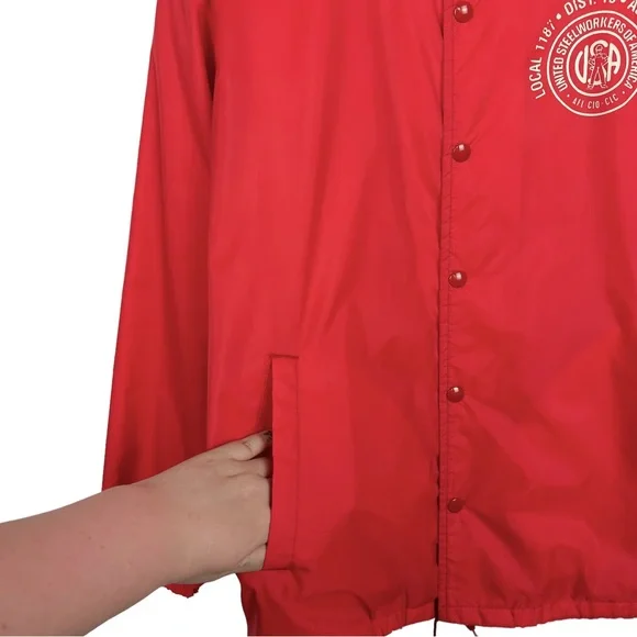 Vintage United Steel Workers Of America Graphic Snap Up Lined Rain Windbreaker Bomber Jacket RedMen's Size-XL/XXL See Measurements Measurements (Approx.)Length-31.5”Pit-Pit-26”Sleeve-26”-Condition -Preloved pilling wear on Inside Slight Mark On Sleeve (photo)CFB-772Goth, Grunge, Hipster, Punk, Streetwear, VTG, Vintage, 90’s, Y2K, Workout, Gym, Loungewear, Comfy, Cozy