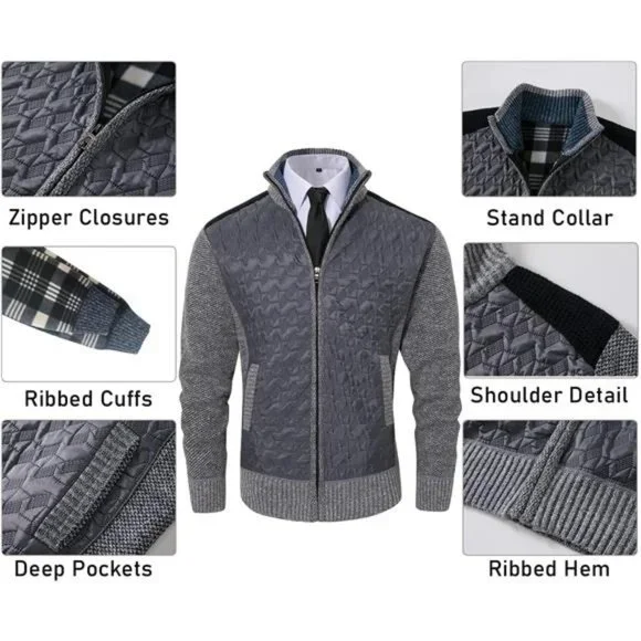 *Fabric type50% Polyester, 40% Acrylic, 10% Anti-pilling fibers*Care instructionsMachine Wash*OriginImported*Closure typeFull-Zipper*Stand collar cardigan sweater jacket, long sleeve,zip up, two-color with block pattern design, ribbed cuffs, hem and collar, 2 slant pockets*Soft fully plaid fleece inner lining, include the arms, keeps you warm and comfortable in autumn and winter. Stretchy fabric, comfortable, breathable, skin-friendly, good skin feeling, comfy to touch and wear*Cardigan sweaters for men match perfectly with casual shirts and pants, classicl and fashion. Gift for you and friends, father's day gifts, birthday present, a dad gifts, Christmas gift idea etc*The warm mens zip front thermal cardigans suitable for outdoor activities and daily casual wear, such as work, dating, party, office, school, wedding, meeting, outdoor and other casual occasions*Machine wash. Cardigan sweater for men with pockets, thick and soft, but it does not wear heavy. Having a