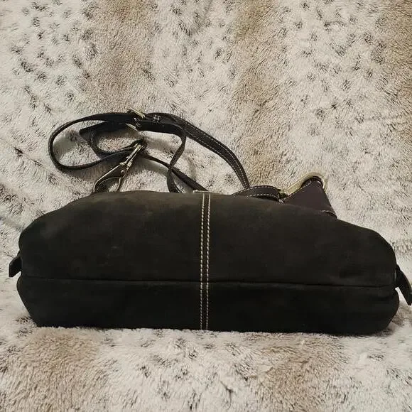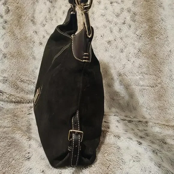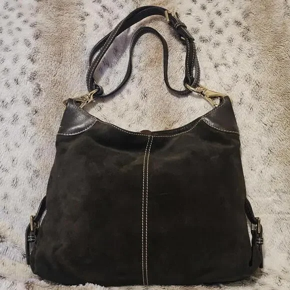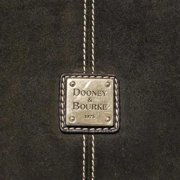 Enhance your style with this elegant Dooney & Bourke shoulder bag, crafted from luxurious dark green suede with rich brown leather accents and sophisticated gold hardware. In excellent condition, this versatile bag features a spacious interior perfect for your essentials, making it ideal for both everyday use and special occasions. Don't miss out on this timeless accessory—it's more than just a bag; it's a statement piece.