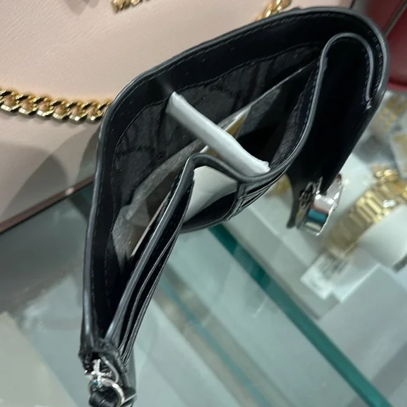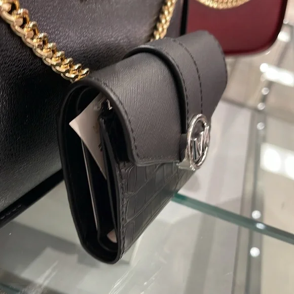 MICHAEL KORSCarmen Medium Faux Leather WalletBlack Crocodile Print Pattern NWT authentic Reimagined in a shrunken silhouette from faux leather, this wallet version of our beloved Carmen bag will stylishly keep your essentials within arm’s reach. Featuring a foldover closure and our iconic charm, it’s as polished as it is practical.• Wallet• Faux leather• 88.92% coated canvas/11.08% polyester• Gold-tone hardware• 4.75"W X 3.75"H X 1.25"D• Exterior details: back slip pocket• Interior details: 2 back zip and slip pockets, 6 card slots, bill compartment, front slip pocket• Snap fastening• Lining: 100% polyester• Imported• Style # 35S2GNMF6L