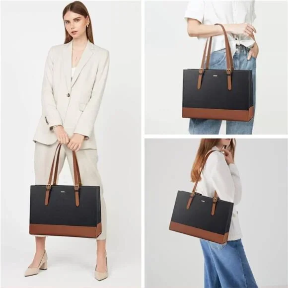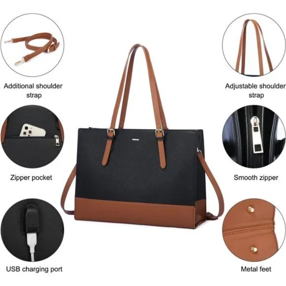 The laptop Bag features a 15.6-inch computer pocket, an iPad pocket, a middle zipper pocket, an internal side zipper pocket, two large opening compartments, two small opening pockets, two pen pockets and an outside zipper pocket. Large enough to keep all your things well organized.The laptop bag for women is made of high-quality PU leather and polyester lining, making it durable and fashionable. Reinforced metal feet will reduce friction and scrape of bottom of the work bag while daily use, last longer than other work bag.The laptop tote bag for women comes with adjustable shoulder strap and additional shoulder strap. Adjust the shoulder strap to right length or additional shoulder strap can function as a shoulder or crossbody strap.With a multi-purpose use and a classy look which never goes out of style, this laptop bag is perfect for work, office, shopping, business, travel and outdoors. The bag can be used as a handbag purse, shoulder bag, tote bag, laptop bag briefcase, computer bag. Perfect gift choice for teachers, attorneys, and all office ladies.