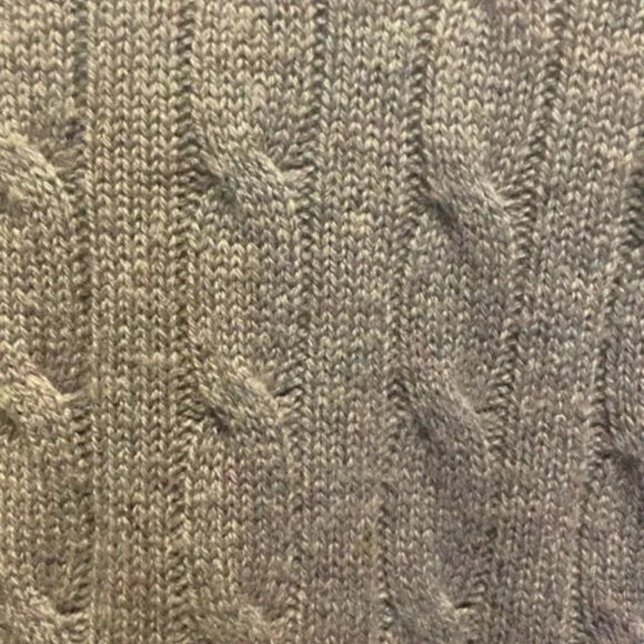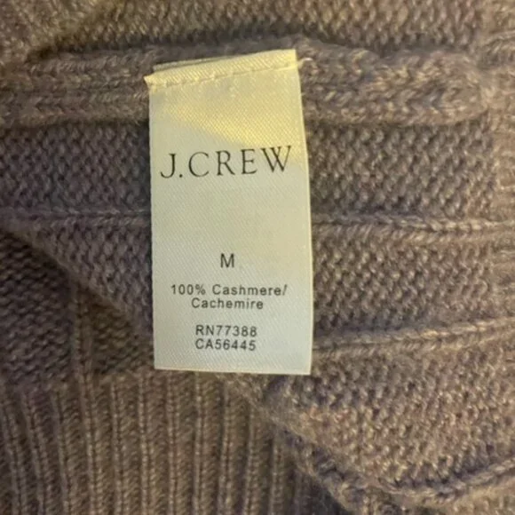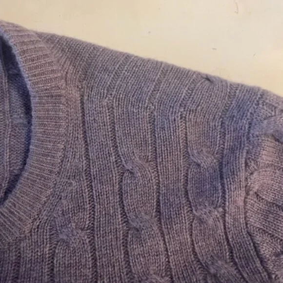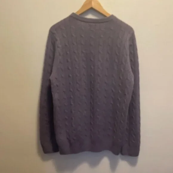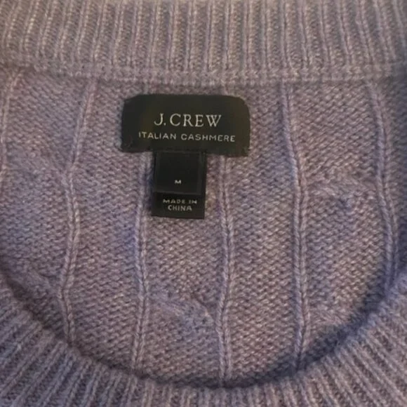 Cashmere cable-knit sweaterJ. Crew upgraded their cashmere collection with finer...loftier fibers to make the soft stuff, somehow, even softer. And because they like to make a lasting impression, their new cashmere is also more enduring than ever—in both quality and style. They're invested in bringing you the best in cashmere, so you can feel great about investing in it too. Sustainable resourced cashmere.Classic crew neck sweater with rib neck and bottom/cuff startsSeamless shoulder and full fashioned armholes Yarn is a 2 ply Italian 100% cashmere in a beautiful heathered top-dye lilac grey shadeStitch is a fine gauge alternating cable and ribBody width at armpit sode to side = 22"Body length from shoulder= 26 1/2"Excellent pre-worn condition, no flaws, from a smoke-free environment