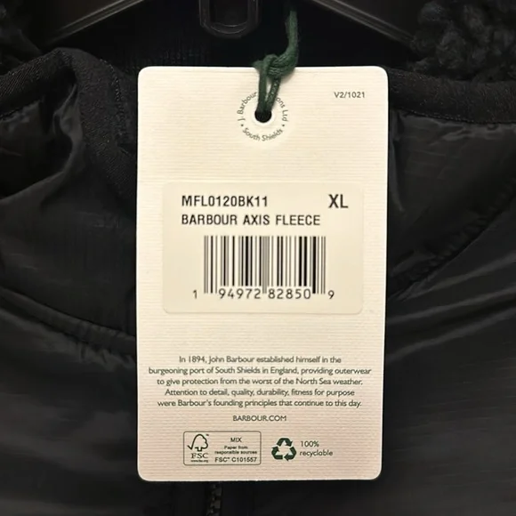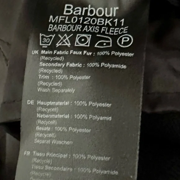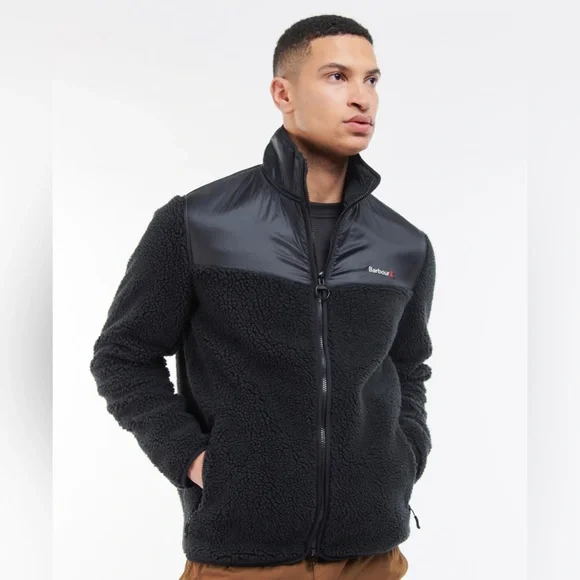 Barbour Men’s Axis Fleece JacketStyle: MFL0120BK11. Color is Black. Size XL.From Barbour:Tailored FitStay warm and comfortable in the Barbour Axis fleece jacket. This men’s casual garment features a contrast shoulder overlay, long sleeves, front zip fastening and classic branding to the chest. Wear it with jeans and boots this weekend.Main fabric faux fur: 100% PolyesterSecondary fabric: 100% PolyamideRipstop outerBarbour 55 Degrees North embroidery to left chest.Barbour embroidered strap to outer centre back neck.Machine wash at 30°C