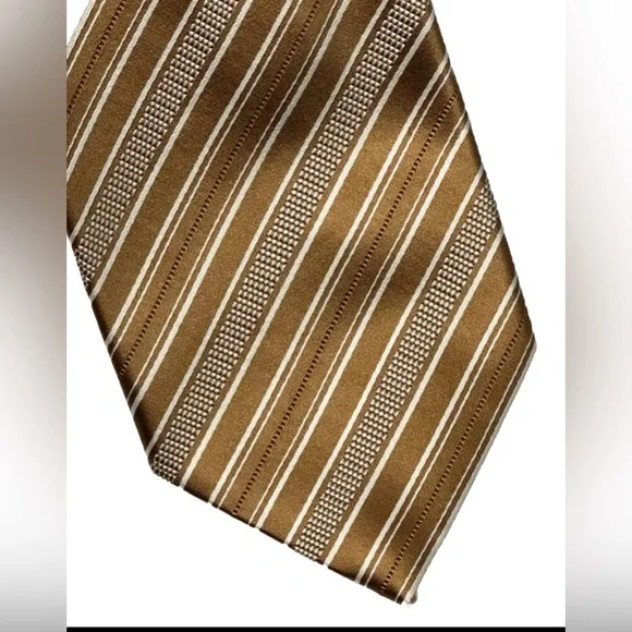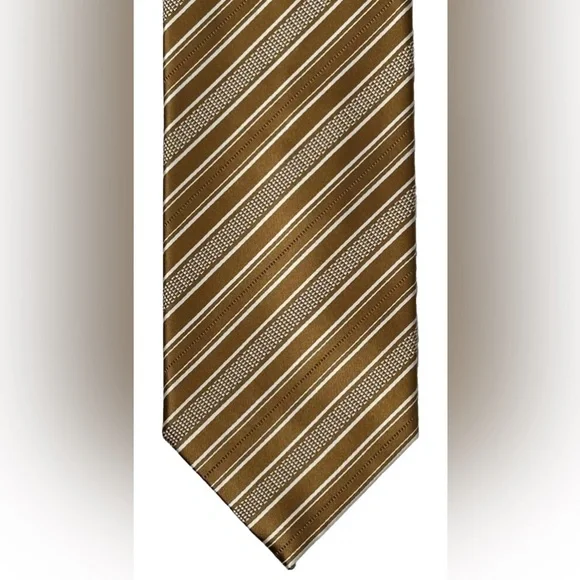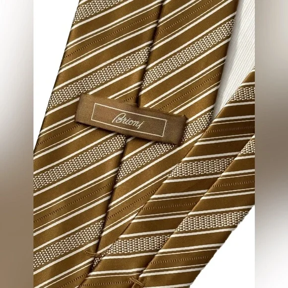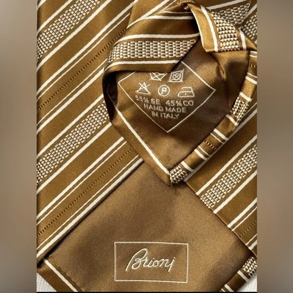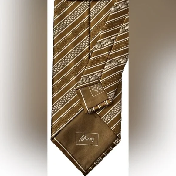 Elevate your style game with this luxurious Brioni tie featuring elegant diagonal stripes in shades of gold and white. Handmade in Italy from a blend of silk and cotton, this classic length tie is the perfect accessory for any fashion-conscious man.The tie is brand new with tags and bears the unmistakable hallmarks of Brioni's world-renowned craftsmanship. With its timeless design and superior quality, this tie is a must-have addition to any wardrobe. Don't miss out on the chance to own a piece of luxury Italian fashion at an unbeatable price.$395 NEW BRIONI TIE DARK GOLD & WHITE DIAGONAL STRIPES HANDMADE LUXURY- NO RETURNS - NO REFUNDS - NO CANCELLATIONS