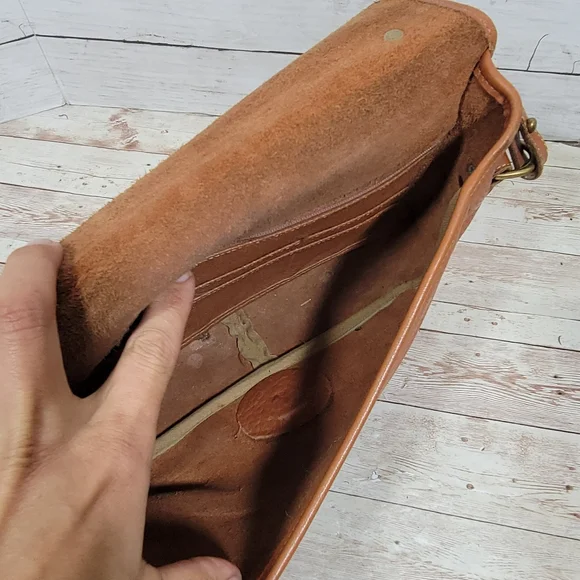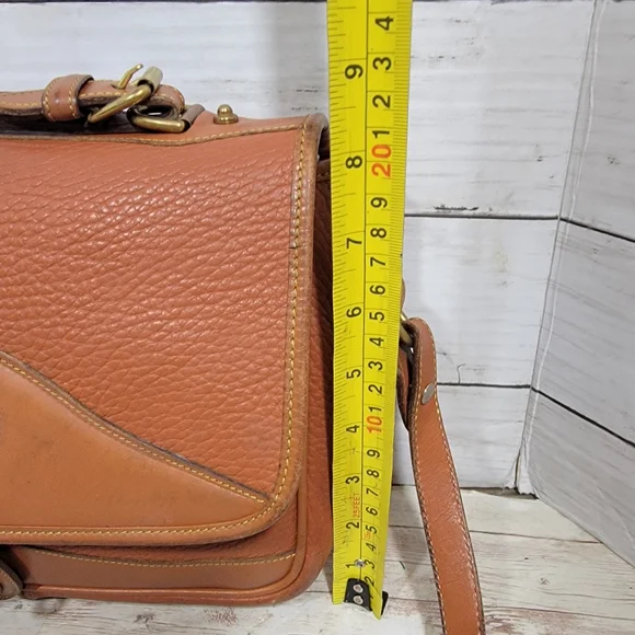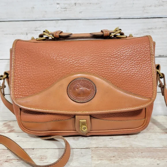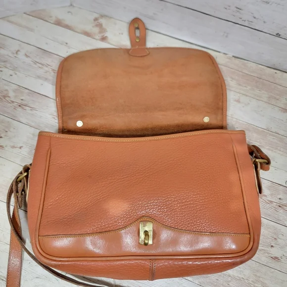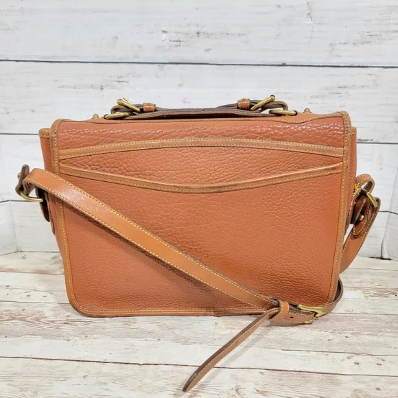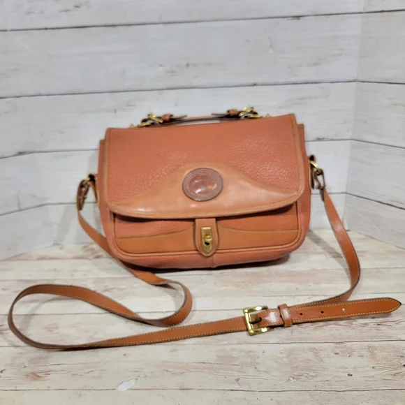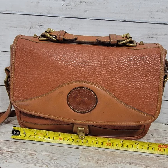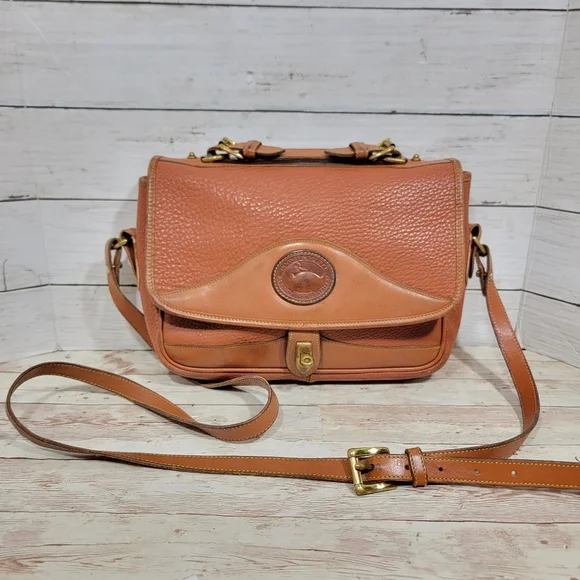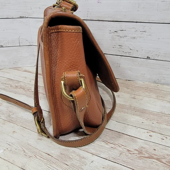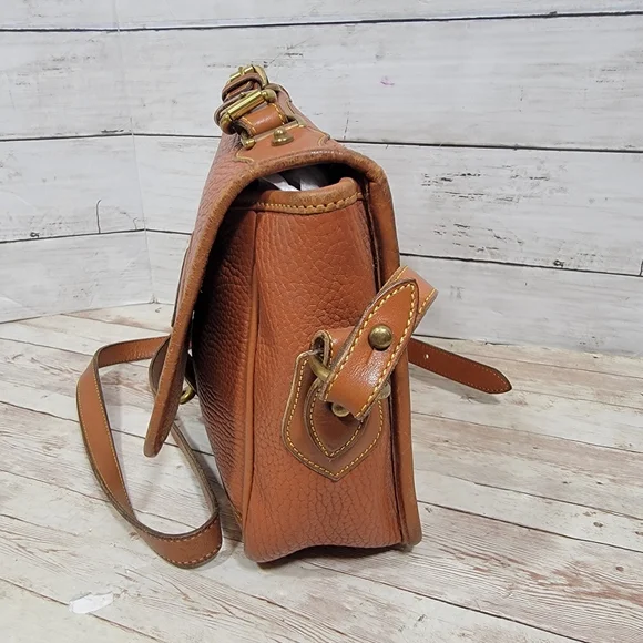 Dooney & Bourke All Weather Pebbled Leather Carrier Bag Fold Over Flap Crossbody Purse Vintage Handbag Convertible Top Handle Shoulder BagVintage from the 1990sRead the full descriptionMaterials: Pebbled Leather, Brass HardwarePre-owned condition.signs of wear throughout from normal use.see pictures for best description.