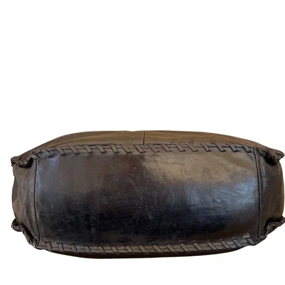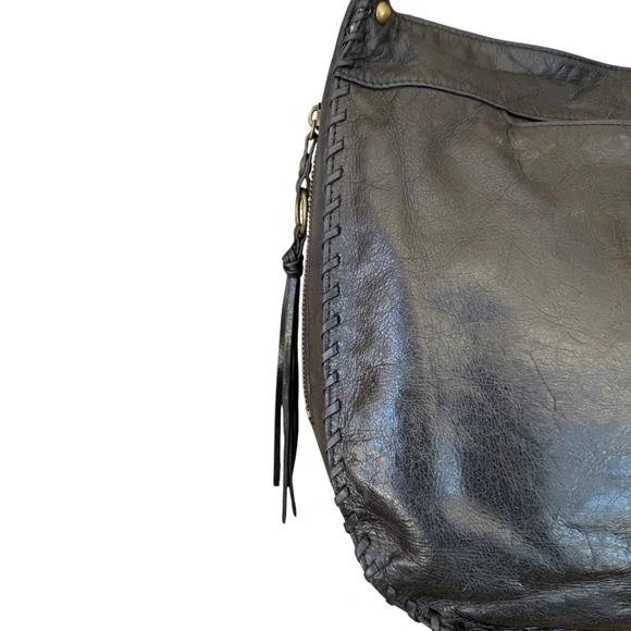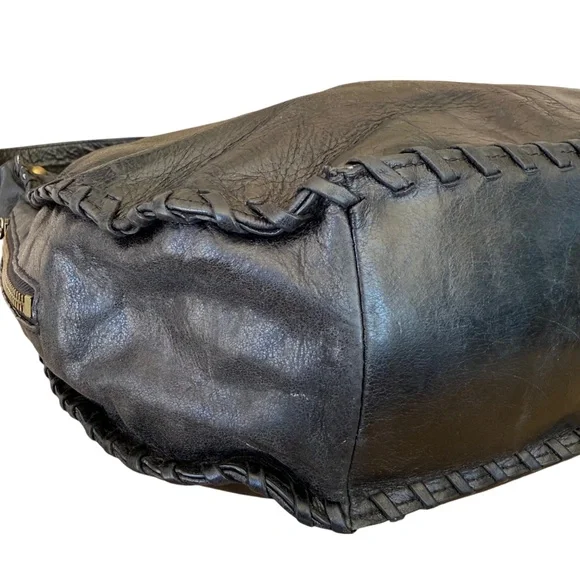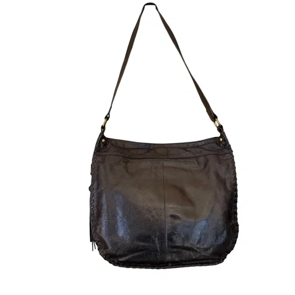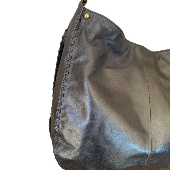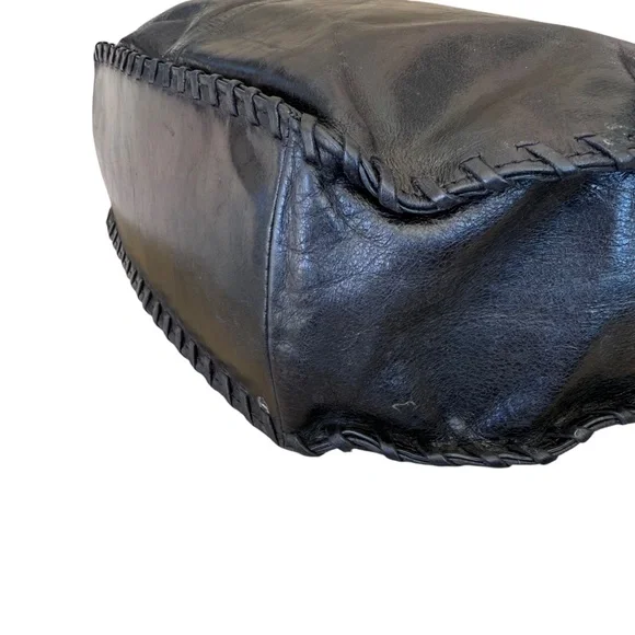 Hobo The Original Bianka Black Leather Whipstitch Edge Shoulder BagClassic meets boho in this Hobo Bianka shoulder bag, crafted from rich black leather and finished with detailed whipstitch edging. The slouchy silhouette, spacious interior, and signature vintage-style lining make it both functional and effortlessly stylish—perfect for everyday wear.A boho-chic design with a styled whipstitch edge and a wide base for easy use. The spacious lined interior includes a zip wall pocket and 2 miscellaneous pockets, and fastens with a magnetic snap. On the outside, a side zip pocket with metal clip and leather tassel stores your keys, and the signature wall pocket on the back stores your cell phone. Extra tumbled leather gives the Bianka its weathered look and soft sheen, that lends itself to work or play. Antique brass hardware.Pair with a flowy blouse and jeans for a relaxed yet polished look, or sling over your shoulder with a midi dress and boots for weekend vibes.Measurements are approximate:15" wide X 11" high X 4" deepStrap drop 13"Excellent pre-owned condition Bundle with more items to save on shipping!Offers always welcome by selecting the offer button!Smoke free, pet friendly home.SKU 5907/7Hobo Bianka bag, black leather shoulder bag, whipstitch handbag, boho chic purse, slouchy leather bag, Hobo The Original, everyday carryall, vintage inspired bag, women’s handbag, classic black purse