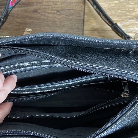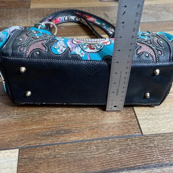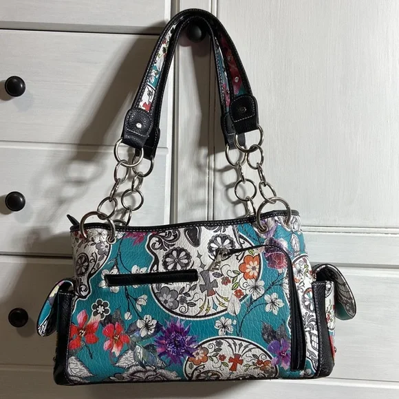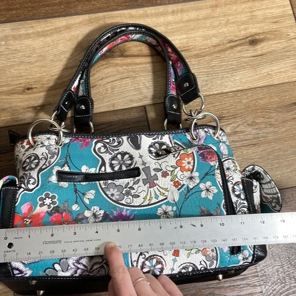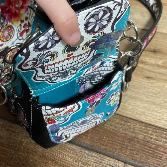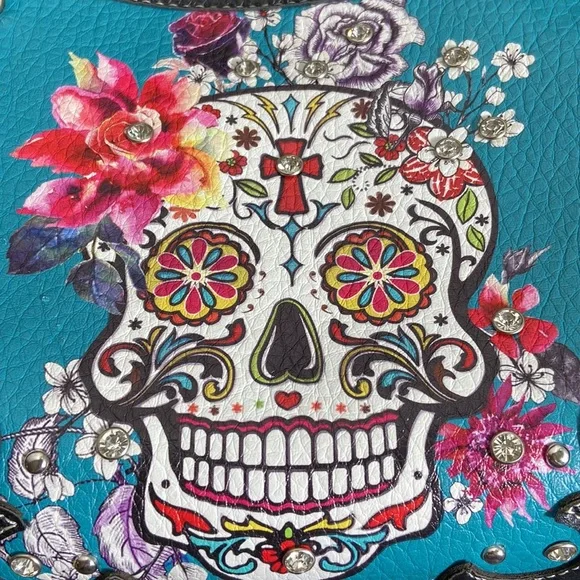 Day of the Dead Concealed Carry Shoulder Bag Purse with Western Cowgirl Boho / Bohemian Vibe. Please refer to photographs for approximate measurements.Back concealed carry zipper pouch. Side button closure pouches.Zip top closure with two interior zipper storage areas. Divided compartment body.Chain and fax leather shoulder strap.Faux leather body.Footed bottom.Rhinestones and studs throughout exterior.Even if you don’t want to carry, you can still use this purse- consider it extra storage! Great condition, although there are a couple of rhinestones missing around the sugar skull, as photographed. No rips, stains, or tears.Smoke free home.L15A-A