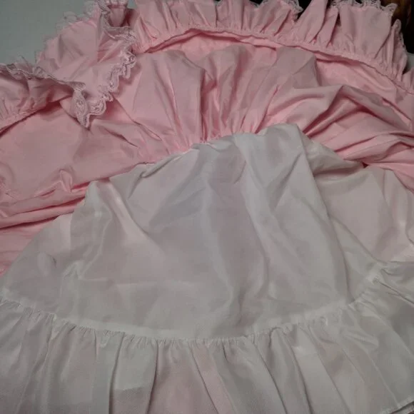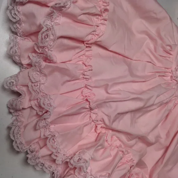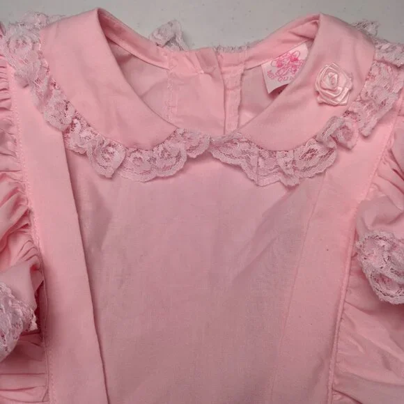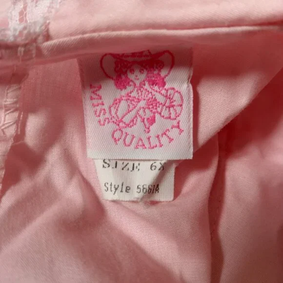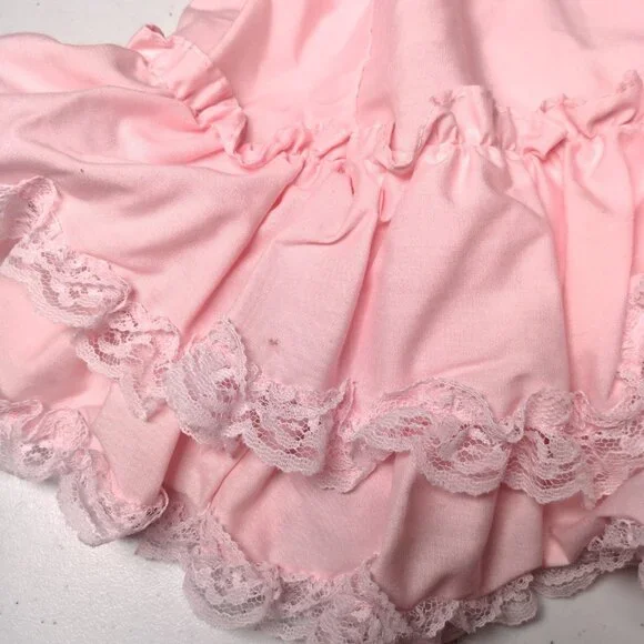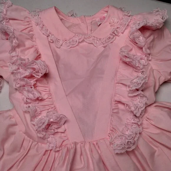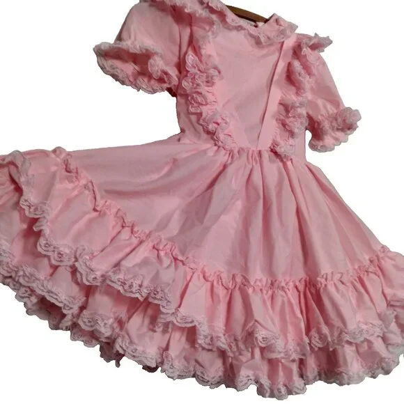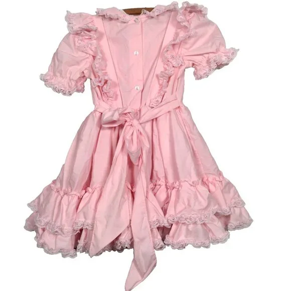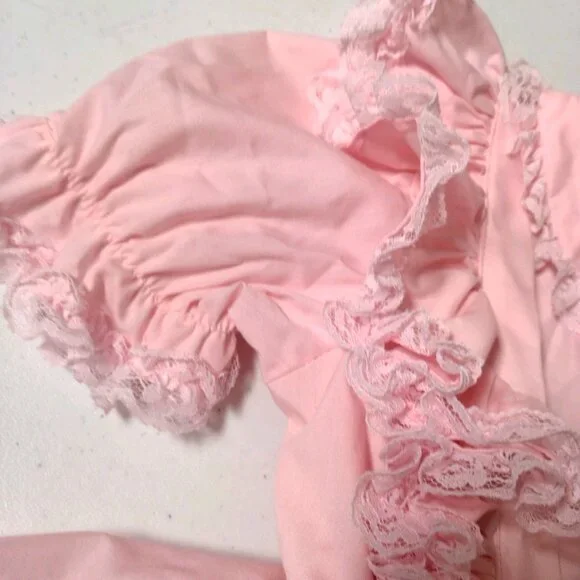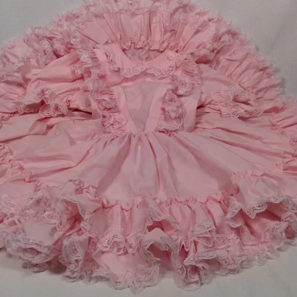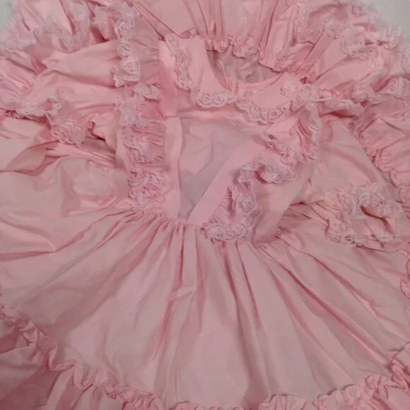 Has a few spots/Imperfections. Please see all pictures closely. No holes or tears. Approximate measurements-9" " across shoulders8" sleeves13" pit to pit20" waist25" longscalloped white lace floral trimButtons up the backBig bow/2 ties on backpoof short sleevestieredruffledfrillyCircle SkirtWill need steamed upon delivery.