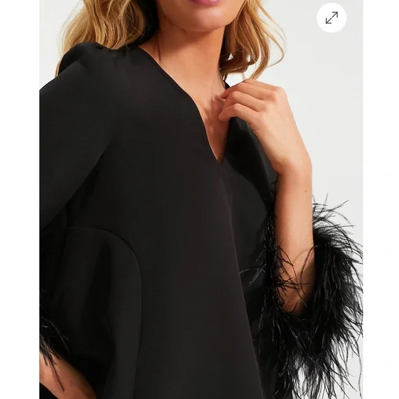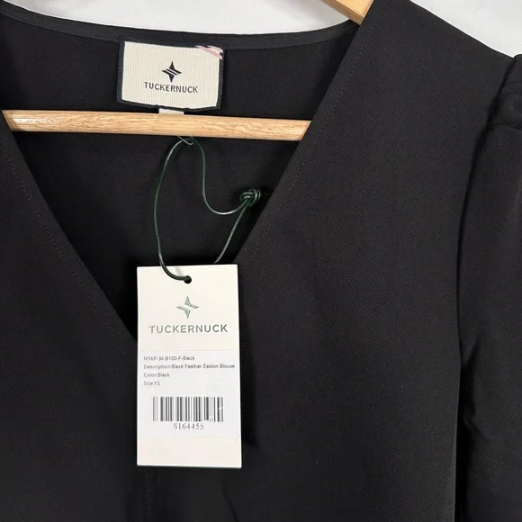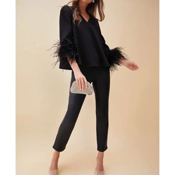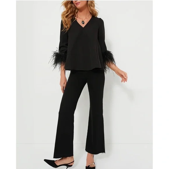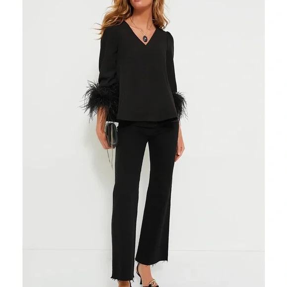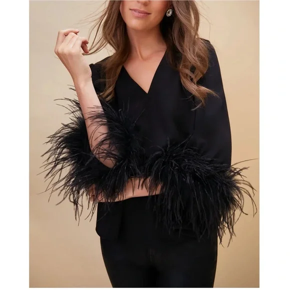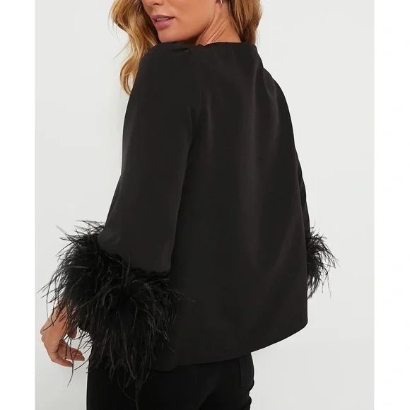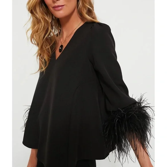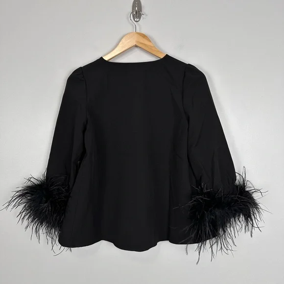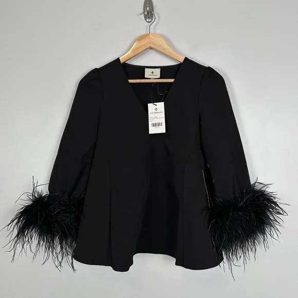 From TUCKERNUCK…This fan-favorite silhouette is back and better than ever — with an update from a vibrant colorway and fun feathered cuffs! The Black Feather Easton Blouse is the fabulous silhouette your closet needs. Detailed with an elegant V-neckline and slightly puffed sleeves with statement-making plumes, this swingy top looks perfect when paired with mini skirts, slim-fitting trousers, wide-leg denim, and just about everything else!V-necklineThree-quarter length blouson sleevesFeathered cuffsSwingy silhouetteMaterial: 97% Polyester, 3% SpandexCare: Dry clean onlyCONDITION: New with Tags / No flawsApproximate measurements flatXS pit to pit 17.5”
