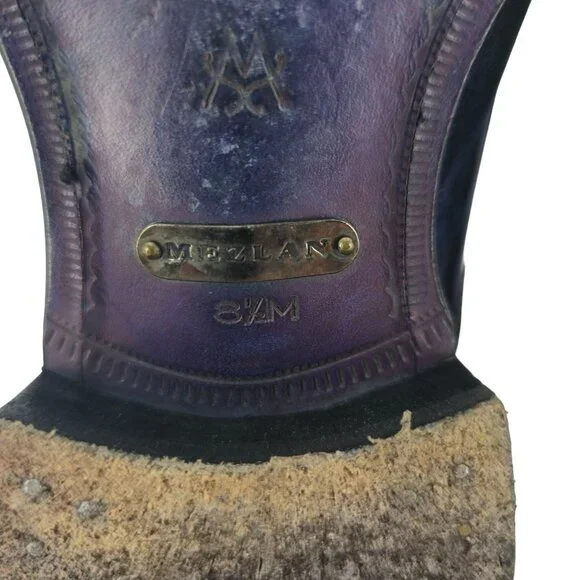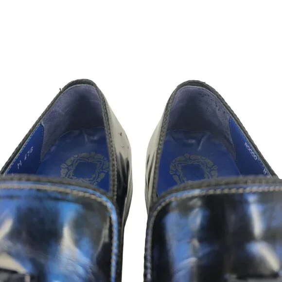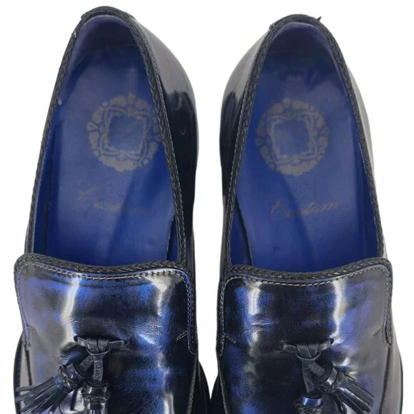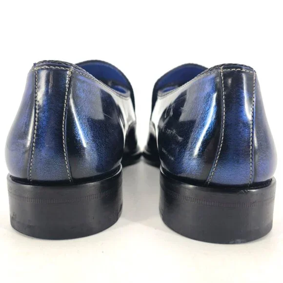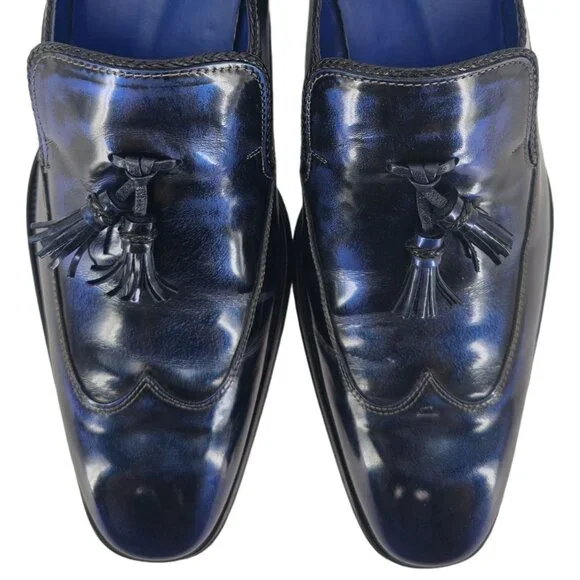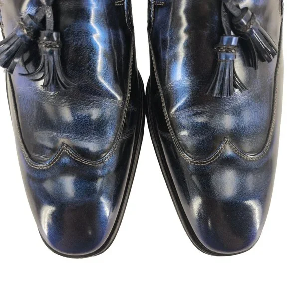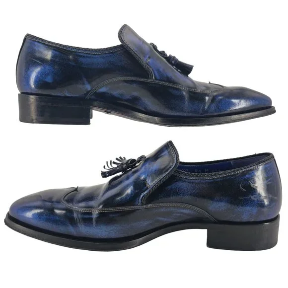 #143MezlanCustom CollectionModel: RoccoGlossy Marbleized Leather Wingtip Tassel LoafersCrafted In SpainOriginal MSRP: $395 (verified)Color: Marbleized Blue / BlackUS Men's size:8.5MBottom Sole Measurements (approx.)Heel to Toe:12 inWidest Spot:4 inInsole foot bed length:11.25 in==Honest Condition Report==Uppers:7/10Moderate wear, creasing, and scrapes. Significant scuffs on inner left heelLinings:9/10Little to no wear to insolesOutsoles:8/10Light wear, firm soles, slight uneven heel wearThese Mezlan Rocco loafers exude a timeless elegance with their glossy, marbleized blue and black leather. The meticulously crafted wingtip design is adorned with tassels, adding a touch of sophistication to any ensemble. Made in Spain, they promise unmatched craftsmanship and style. Step into luxury and make a statement with every stride.Trusted Seller with near perfect feedback!Shoe trees and other props are for display only unless otherwise mentioned in item description/title