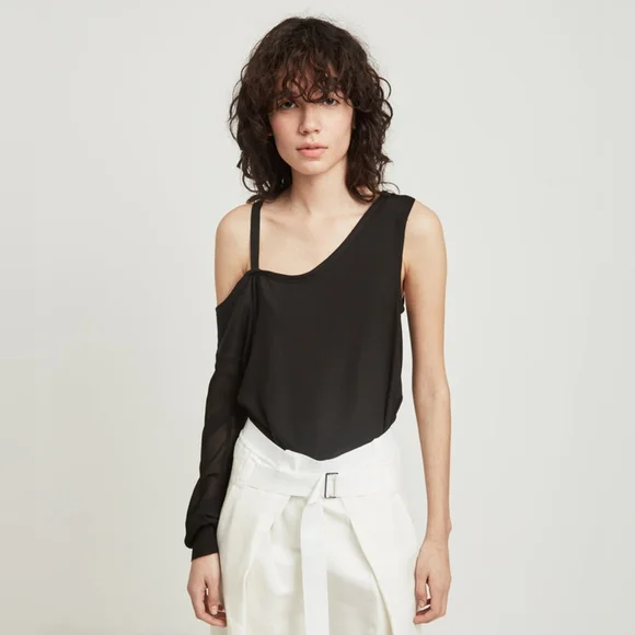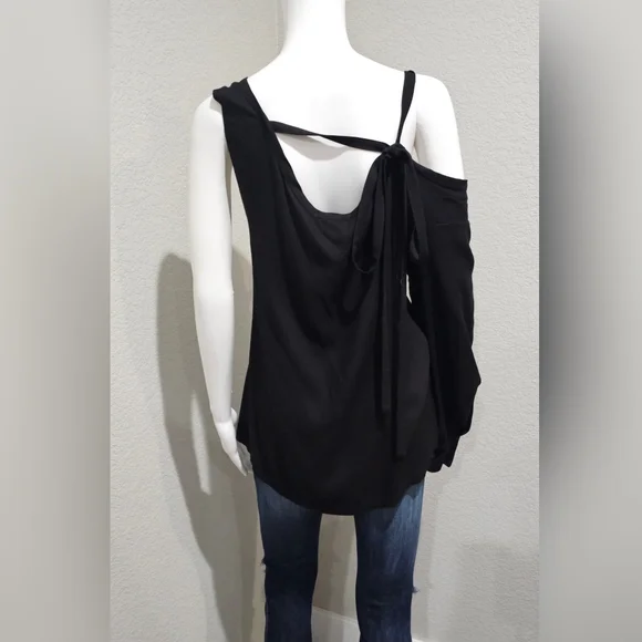 Chic and stylish black off-shoulder asymmetrical top perfect for any occasion. Elevate your wardrobe with this versatile piece. In great condition. Baggie and oversized but measures approximately 20" across the chest and 26.75" shoulder to hem in the front and another 2" longer in the back.Labeledsize 36.