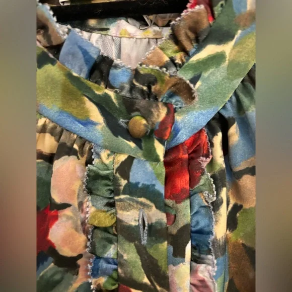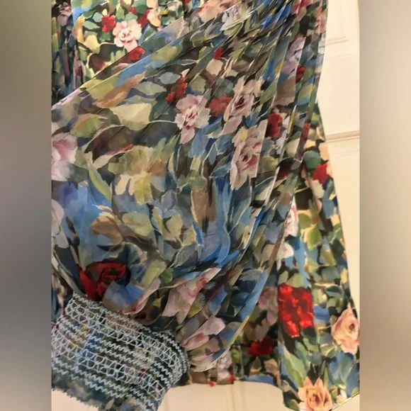 Ilan Floral Silk Ruffle Blouse, worn once. There are 2 tiny pulls that go down from the arm hole. You have to be up close and know where they are to even notice them.Completed with a vivid floral print, Alice + Olivia's Ilan shirt showcases a ruffled stand collar and button placket. This charming design frames the tailored body with long-shirred sleeves and smocked cuffs.Stand collarLong sleeves, smocked cuffsButton-front closure100% polyesterLining: 95% recycled polyester/5% elastane