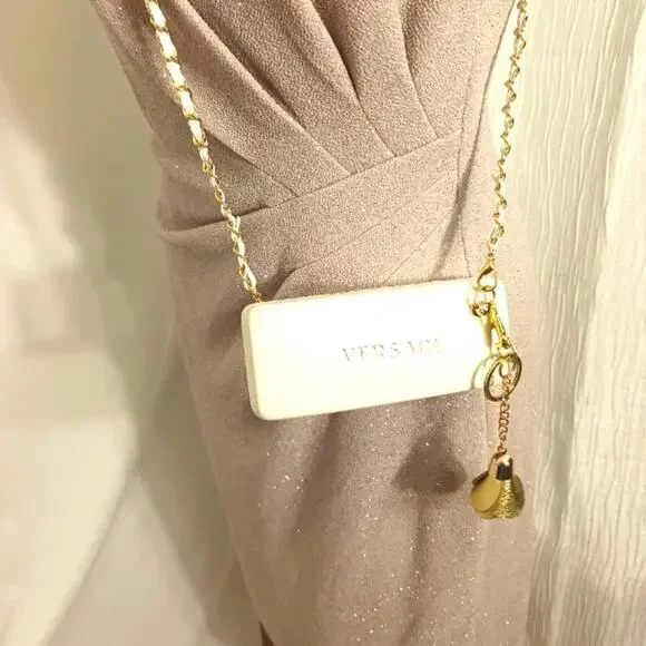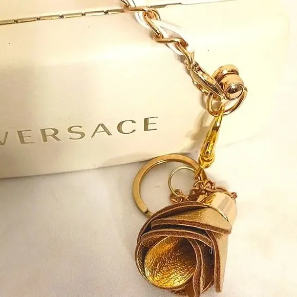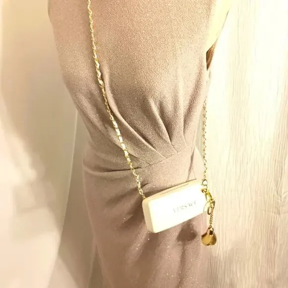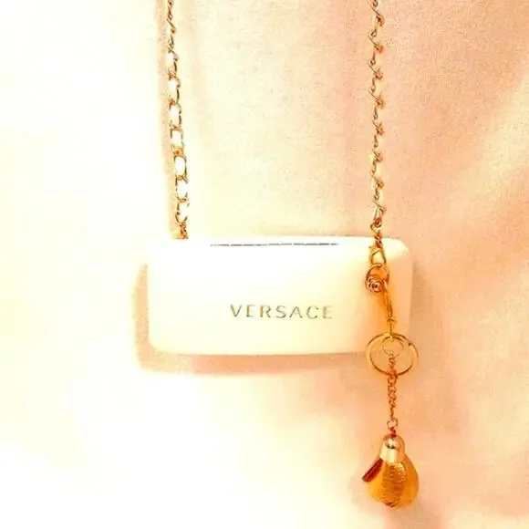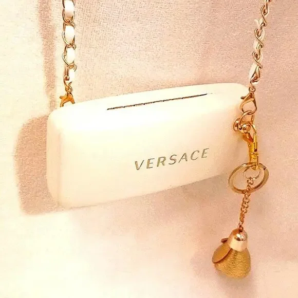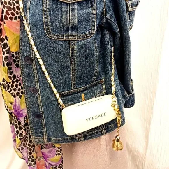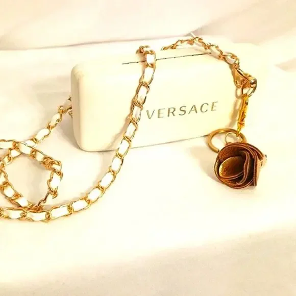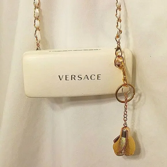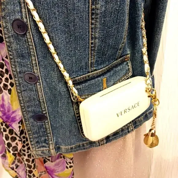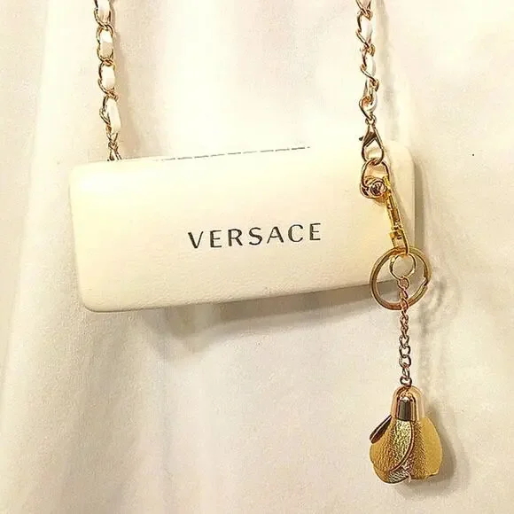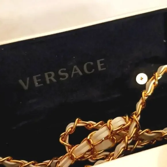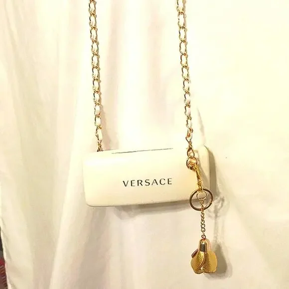 Versace Crossbody SUNGLASS Mini BAG Shoulder Clutch w Gold Chain & Charm addedWHITE with Gold Weave Leatherette Crossbody Strap & Camelia Rose Tassel Key ChainSUNGLASS BAG Perfect Mini Crossbody Sunglass Case to never loose your sunglasses!Carry as a Crossbody while you are busy in your day, traveling, cruising the yacht or out and about running your errands.This fun & pretty compact case also makes a sturdy mini shoulder bag to carry your lipstick and mini essentials.Can be a Crossbody, Shoulder Bag, Handheld Clutch, etc.100% AuthenticVersaceSunglasses CaseVersace Metal Case White Leather outsideGold Versace Letters outside Black Velvet insideVersace Stamped Letters inside Strong Magnetic ClosureFeatures AddedNon-Branded:2 Gold custom brass D-rings,Removable faux Leather Camelia Rose TasselKey Ring & HookWhite Weaved Leatherette Crossbody Shoulder Strap Chain(Chain strap & Tassel are removable)Measures Approximately:6" x 2.5"x 1.5" CaseChain Strap 46" 23" Hang LengthCondition: Clean Pre-loved Sunglass case has light normal wear, fade, scratches, or wear. Velvet inside is in good condition and may have normal vintage light use.D-rings were custom added to the metal case. The non-branded Chain Strap & Rose Tassel are new.Please see photos for more detail.Inventory #VR625