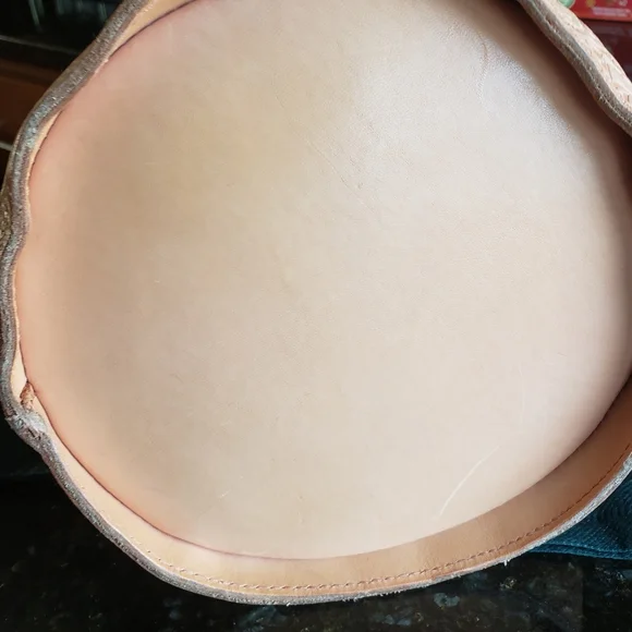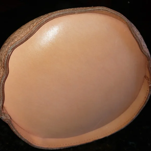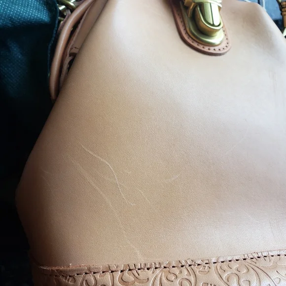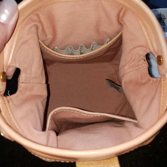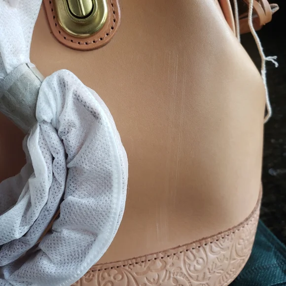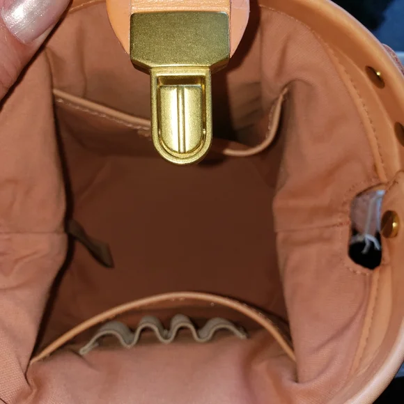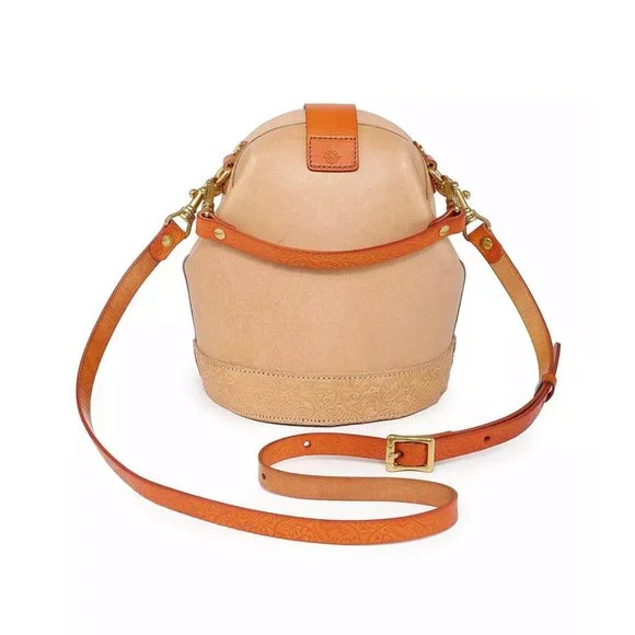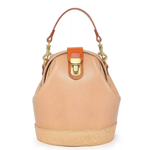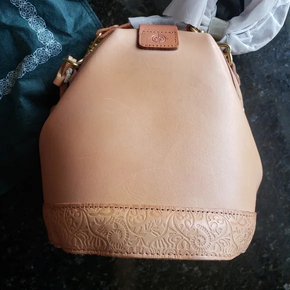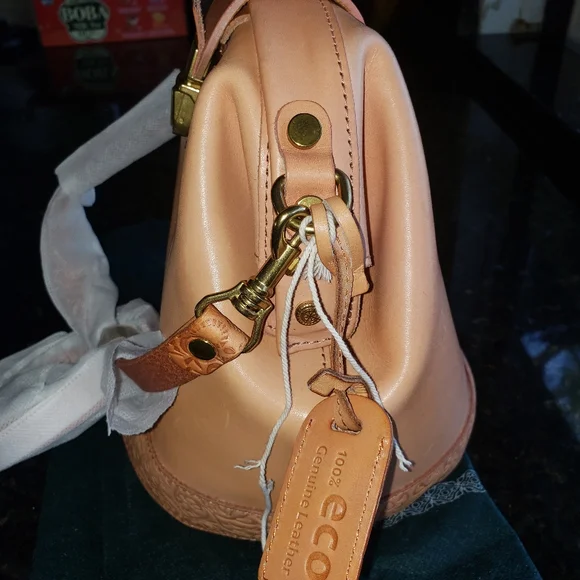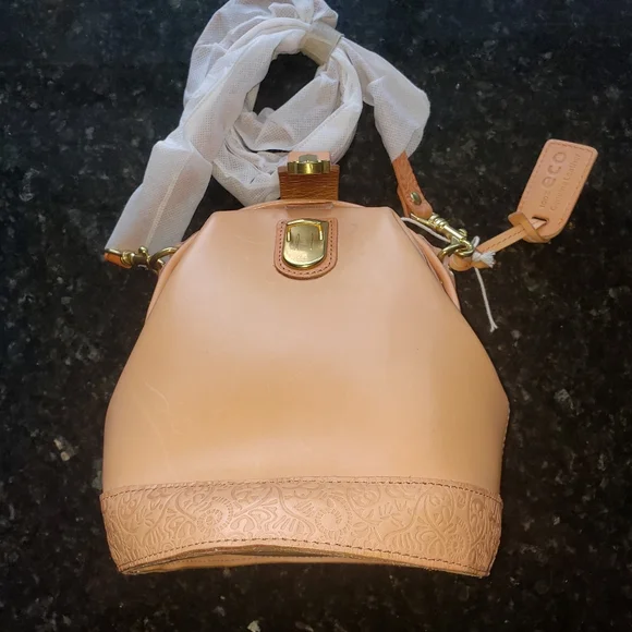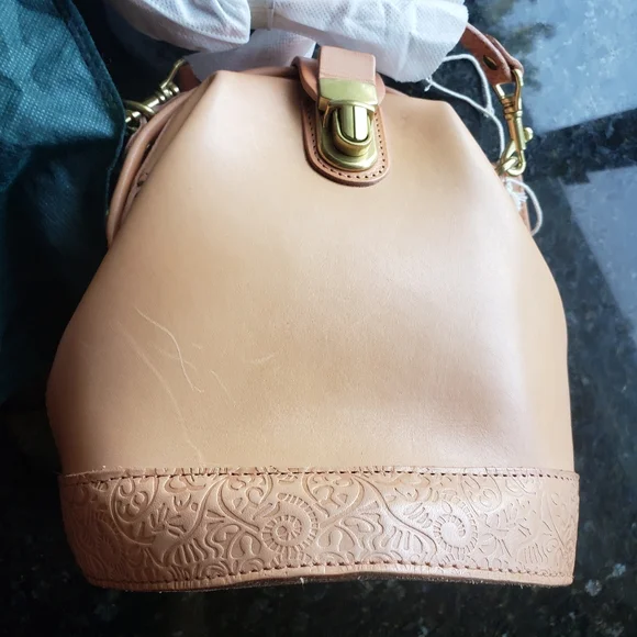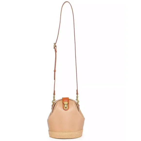 NEW-----BlushStore display, some scratches shown in the photos Simple things are often the best. Our minimalist genuine leather Doctor Bucket Crossbody convertible bag is an effortless crossbody you'll want to use everyday. Designed with comfort in mind, it can be easily carried by the top handle or by your side.Material: 100% genuine leather, 100% vegetable base dyes, 100% recycled hardware- solid brass and copper, 100% interior cotton liningMeasurements - mini sized bag, 7" W x 9" H x 7" DStrap type - 4" L top handle drop, 24" L adjustable and detachable shoulder strap dropClosure - hingeExterior detail - embossed old trend logo, exterior push-lock closure, detachable top handle, and gold-tone exterior hardwareInterior detail - interior cotton lining, embossed old trend logo, 2 sleeve pockets, 4 multi-purpose slotsWeight - 1 lbs