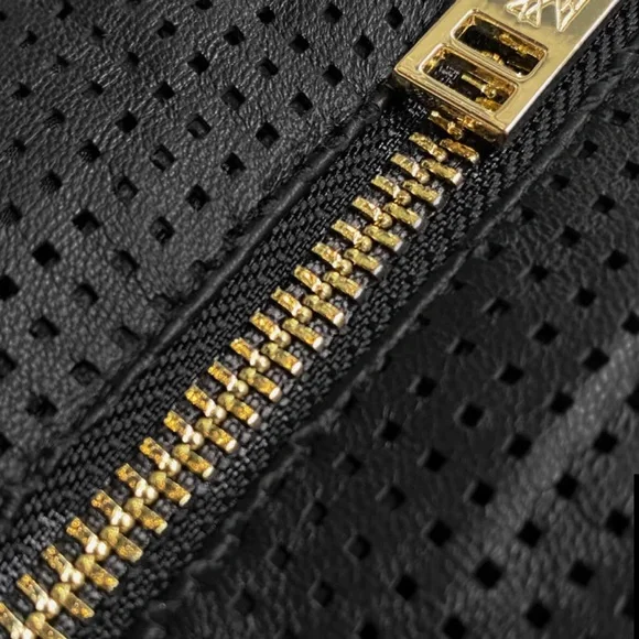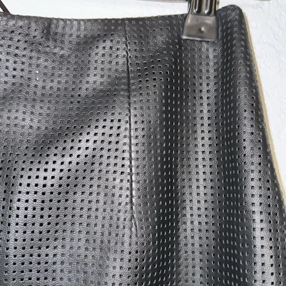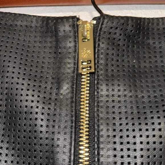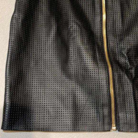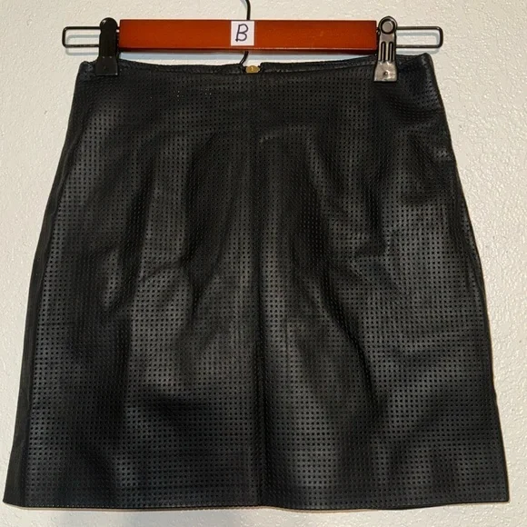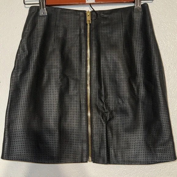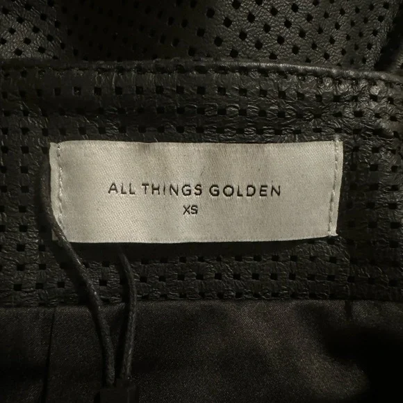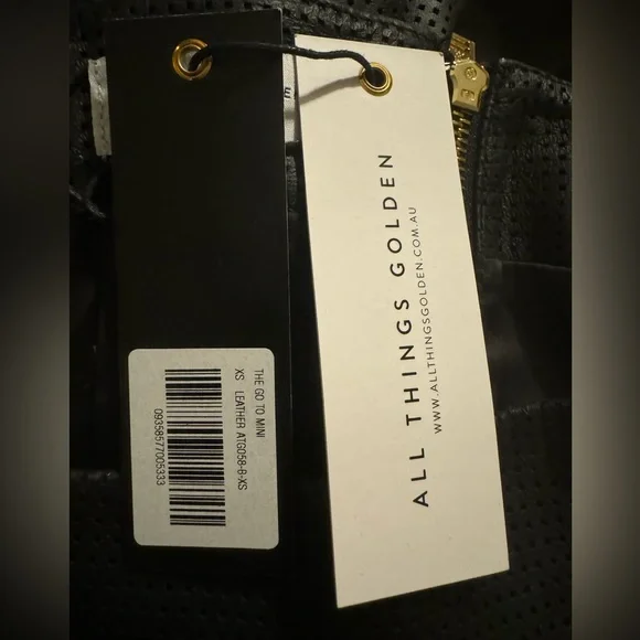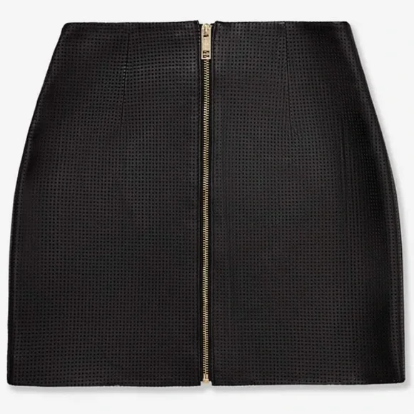 New The Go To Mini Leather Skirt from All Things Golden. Size XS, Black in color. A good leather skirt never dies. A classic shape with a perforated edge, this year round staple can be taken from day to night with ease. Perfect to pair with your A.T.G Basics and A.T.G Knits.DETAILS:100% leather | Lining: 100% polyester. High-rise fit sits just over belly button. All Things Golden custom exposed gold zip at back.