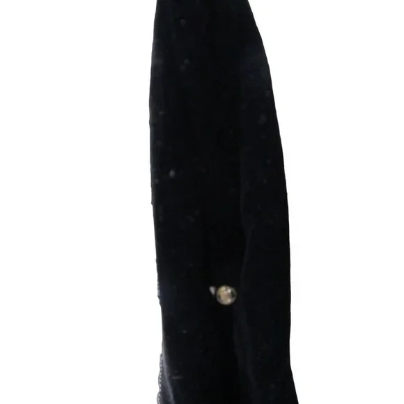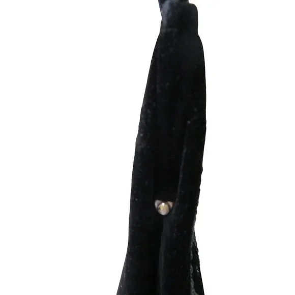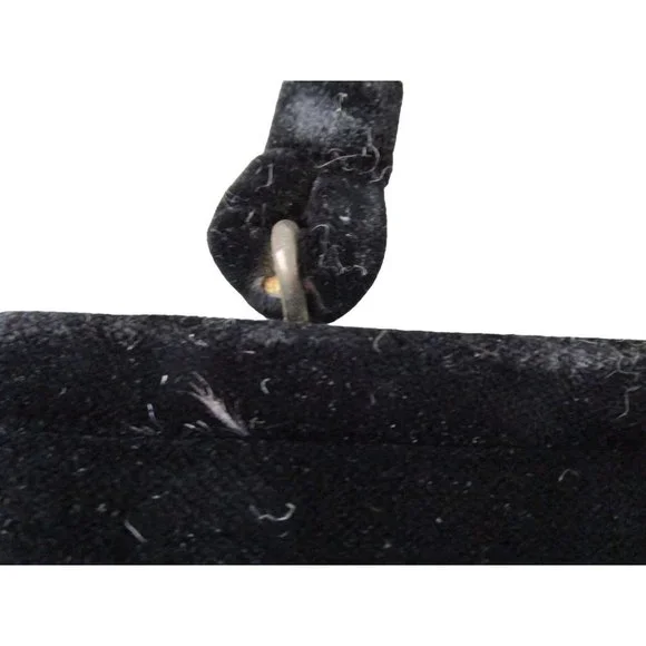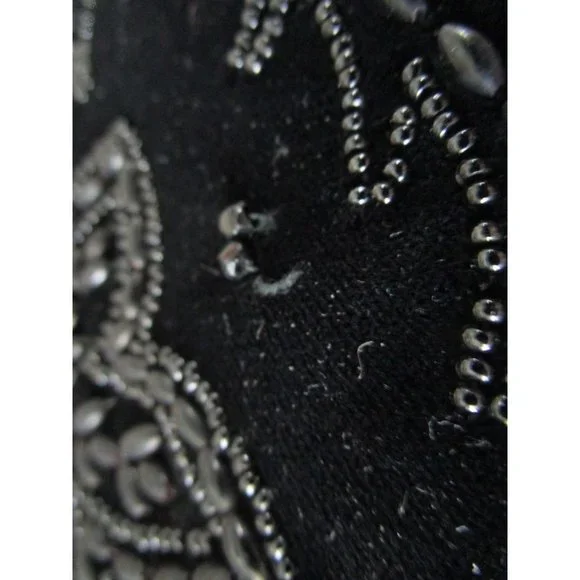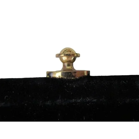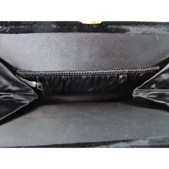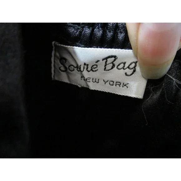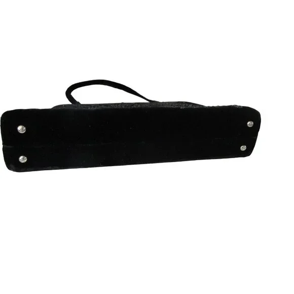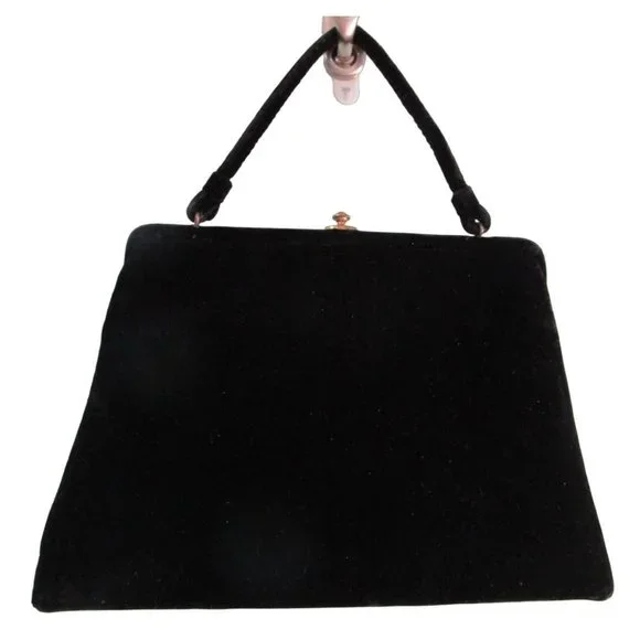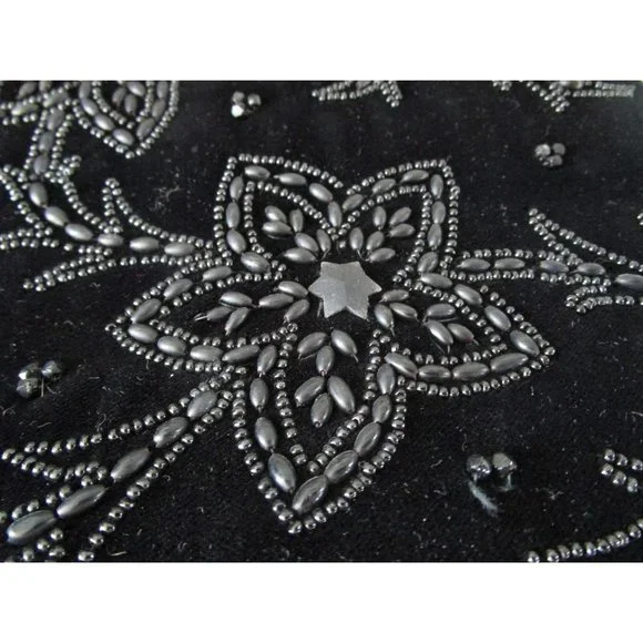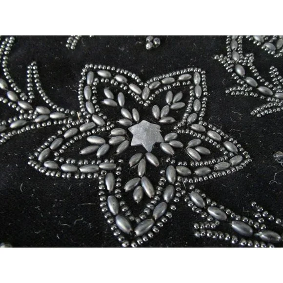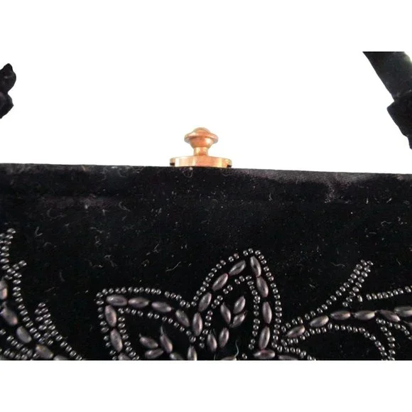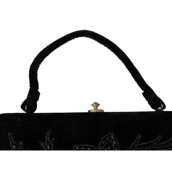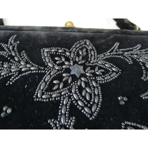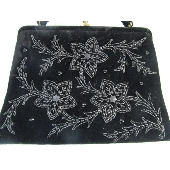 Vintage Soure' Bag, New York City - intricately beaded with jet black beads in a floral pattern, framed in lush velvet. Comes with a gold tone clasp and feet, and a single velvet rope strap. Interior lined with black satin and features an elastic top side pocket. Hard lining at sides is creased on each side toward bottom, does not effect use or style. 1940's - 1950's, made in New York City, United States. Star shape beaded flowers with star shape bead centers. Nice tight clasp.• Vintage Soure' Handbag• Jet black beaded floral pattern• Framed in velvet with gold tone accents• Single velvet rope strap• Black satin interior lining• One elastic top side pocketFeatures:• Black Velvet, Black Beads• Made in United StatesMeasurements:Strap Drop 5.5 in / 14 cmLength 13 in / 33 cmHeight 9 in / 23 cmWidth 2.5 in / 6 cmCondition: Pre-Owned GoodHard lining at sides is creased toward bottom of each side. May show minor wear to velvet, gold tone hardware shows wear and tarnish. May have loose and/or missing beads. May show minor defects in manufacture and decoration.