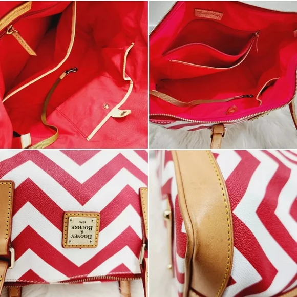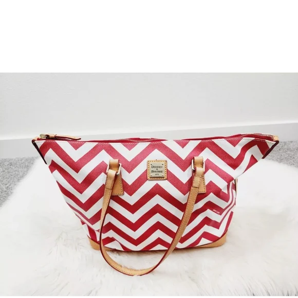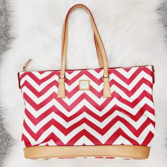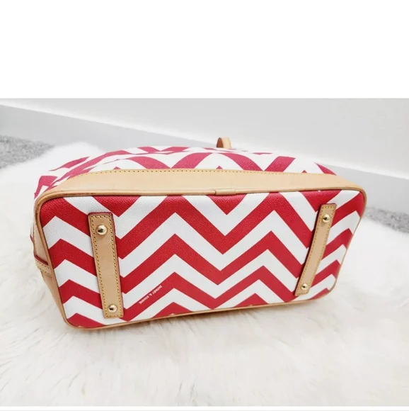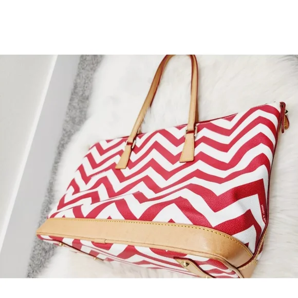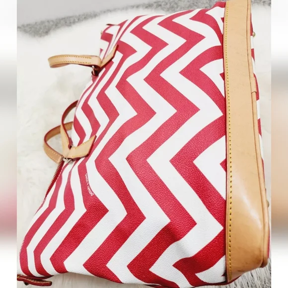 Stylish and spacious, the Dooney & Bourke Chevron Tote Bag w/Matching pouch/wristlet is perfect for any occasion. Featuring a vibrant red and white chevron pattern, this bag adds a pop of color to your outfit. Crafted with quality materials, it offers both durability and elegance. Minor water marks on the vachetta leather bottom trim. Smoke free home.