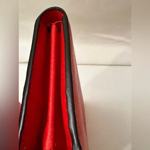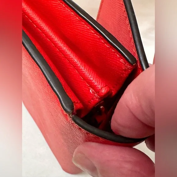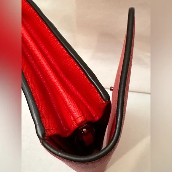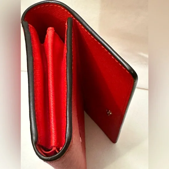 Size is 7 1/2 x 4 1/4 with 6 cc slots3 on each side, in the middle a coin pocket with zipper( very minor residue) and one billfold pocket. Very minor issue on piping. . Snap is snappy and zipper zippy😉any questions please don’t hesitate to contact me. It’s overall in beautiful condition knowing it is pre-loved.