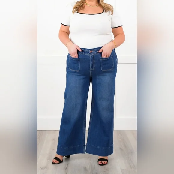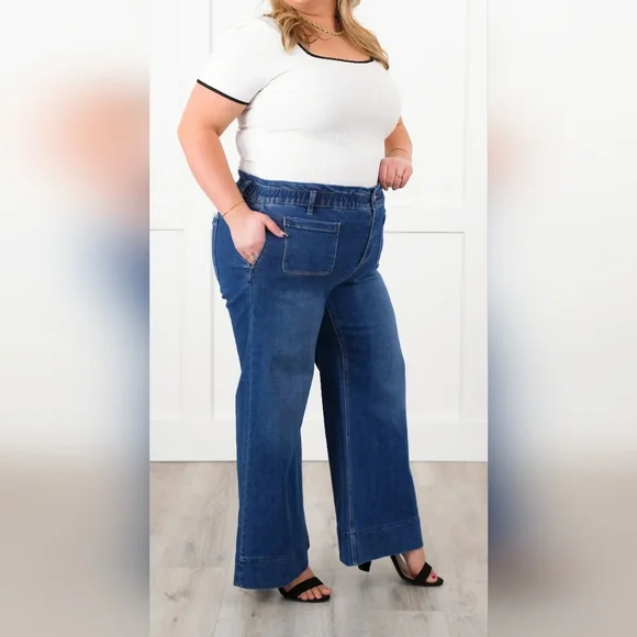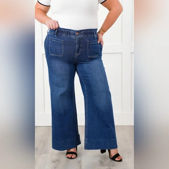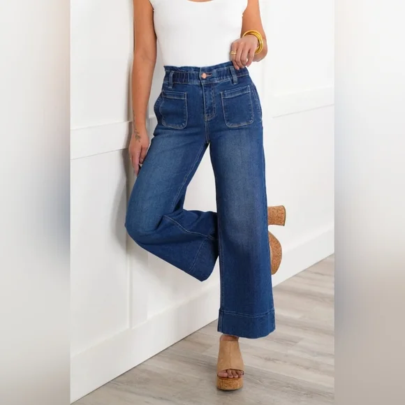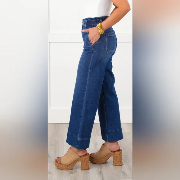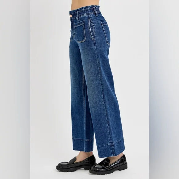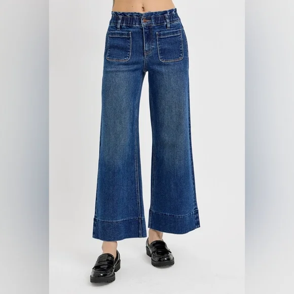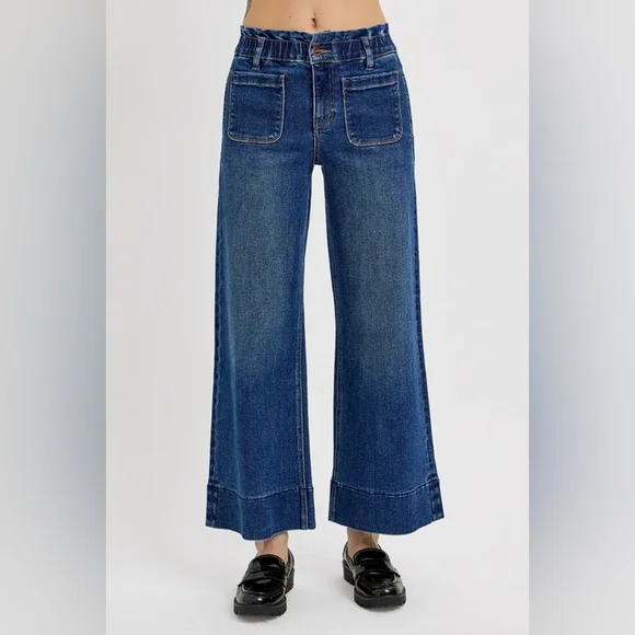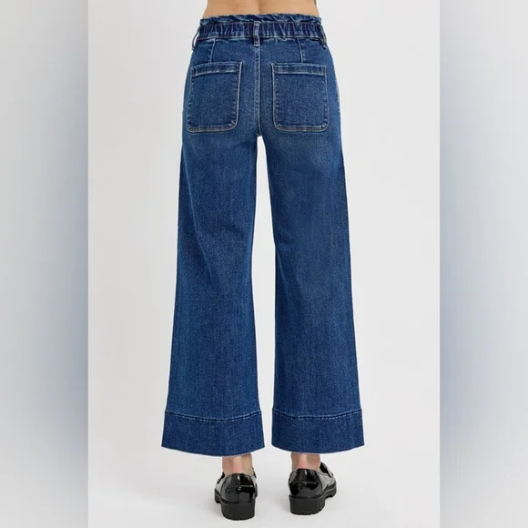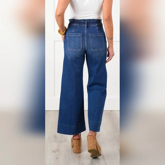 BEST SELLER & selling quickly!risen wide leg crops in dark wash rise: 11"inseam - size 3: 27.5" | size 7: 28" | size 15: 28.5"• comfortable high rise • mini paperbag ruffled elastic waistband with button and zipper closure• patch front pockets, and sewn darts above each back pocket to add form and structure• trendy retro inspired wide leg silhouette with a cropped inseam is fitted through the hips, wide through the thighs and hems• dark wash, no distressing, and sewn wide trouser hems• quality denim with stretch for everyday wear• retail/boutique/new - like buying from a store ☆ due to high demand please allow a few extra business days for processing before being shipped ♡ To find your usual "odd" size, take your most comfortable dept store size and subtract 1. ie: dept store size 10 - 1 = odd size 9/29. This will be your usual odd size, and your starting point, then follow the fit & wear for each pair. If you have any questions, please don't hesitate to ask!♡ Fit & Wear For This Pair:× fit: true to size surg lots of stretch, go with your usual odd size× wear: with the mini paperbag waist, patch front pockets, wide trouser hem, and wide cropped silhouette, these check off all the boxes on the trend list. the dark wash and no distressing make them perfect for dressing up or down. they're crazy cute y'all, a must have! check out the closet - lots of denim new & preloved | bundle & save | reasonable offers welcome/accepted