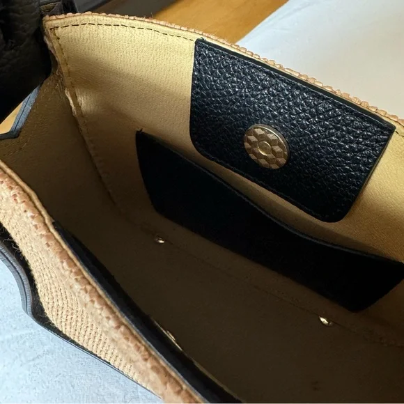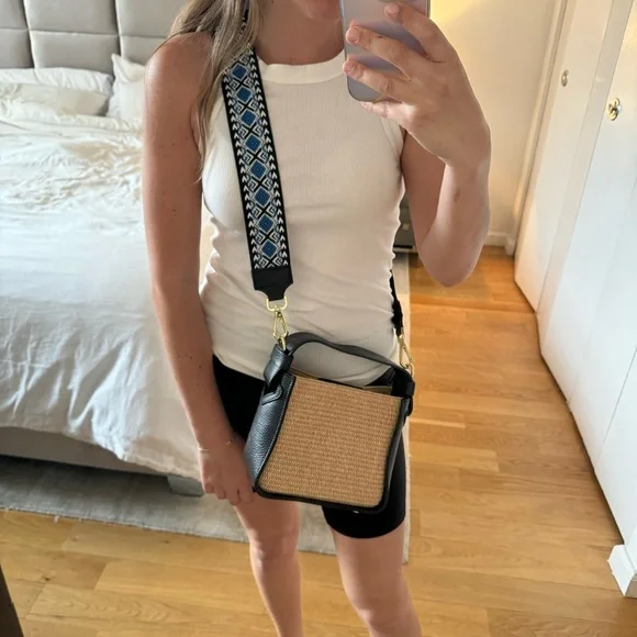 Black Leather and Raffia Straw Bag Purchased at Carro Positano in Italy Genuine Leather 🇮🇹Leather and raffia bag with blue crossbody strap. Cross strap is removable, can be changed, and even worn without! Has gold hardware at the bottom to keep the leather protected. Never worn!No signs of wear. Beautiful condition! Perfect summer/traveling bag!