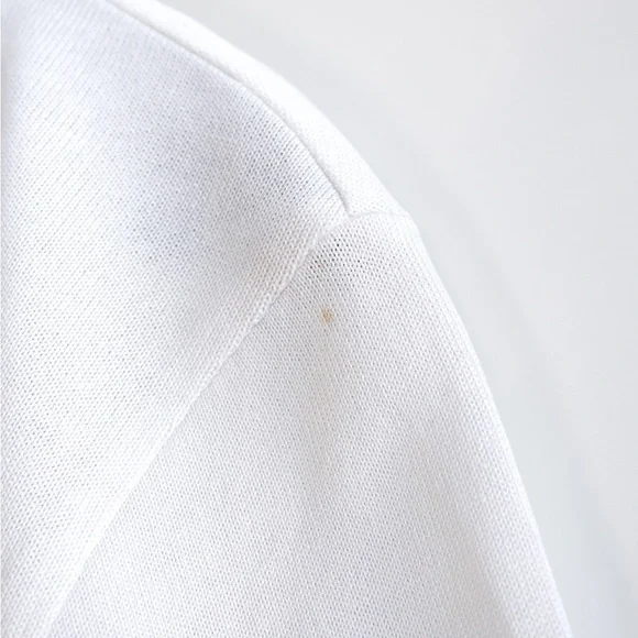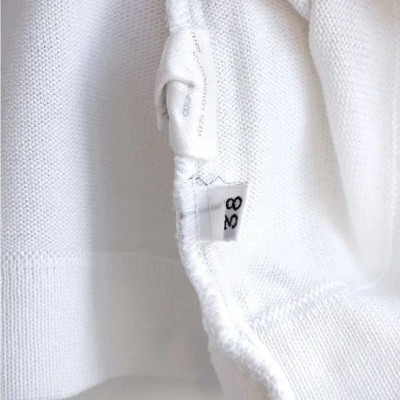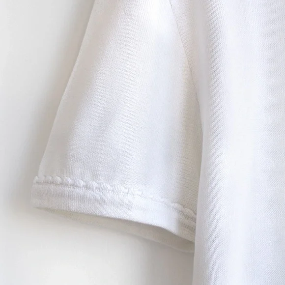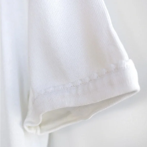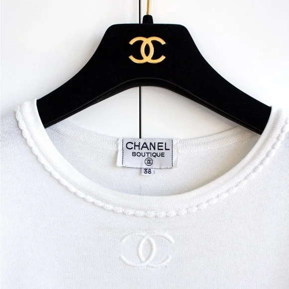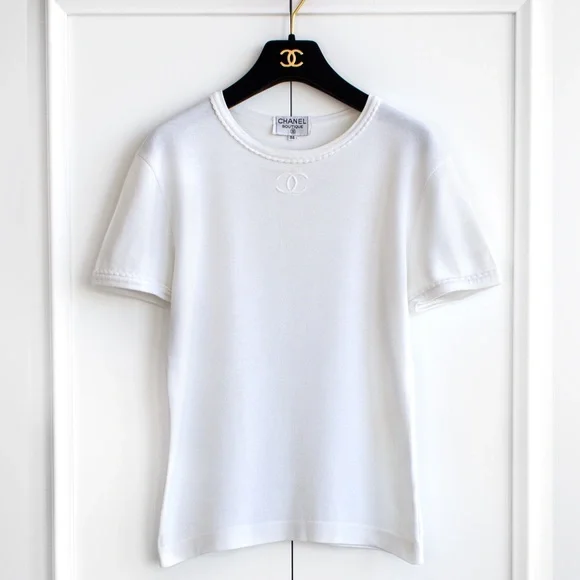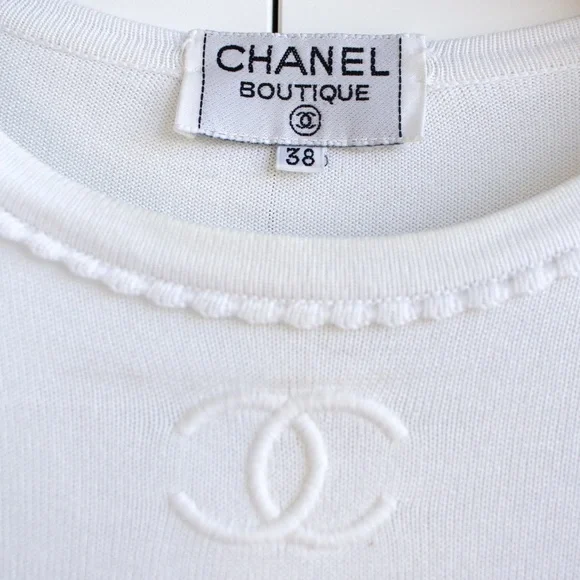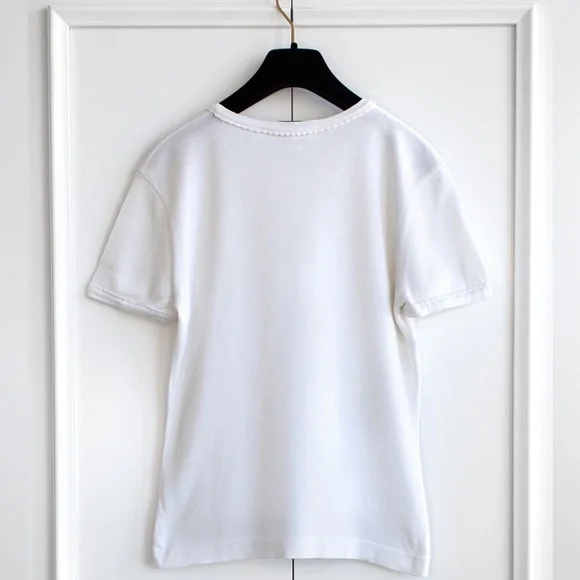 Charming white Chanel Spring/Summer 1994 collection tee featuring an embroidered CC logo and delicate scalloped trims. This garment is in excellent condition, showing no obvious signs of wear, with the only imperfection being a tiny pin-sized spot on the back. Size FR38, measurements: shoulder 17", bust 36", waist 30", length 24", sleeve 7".