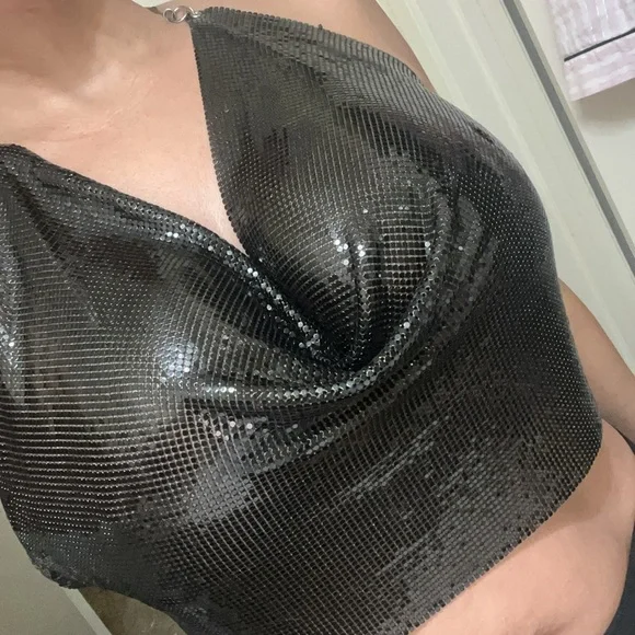 Vintage Paco Rabanne metal mesh crop top with open back, in excellent condition.From my own personal collection - ONE owner (me)COLLECTORS ITEM-Black-Used -Metal MeshApproximate Measurements:Length 20", Height 12.3", Strap length 6" and the longest one is 8"-Made in France-100% AuthenticI’m 34DD ( as shown in pic)158lbsWill fit differently on body types One sicze fits allFINAL SALE