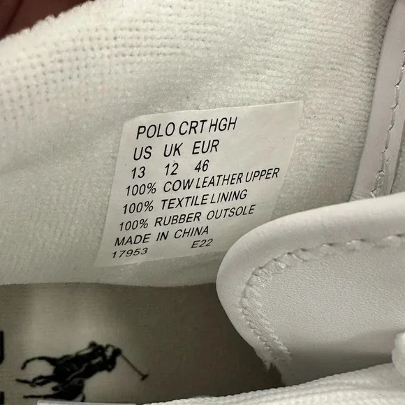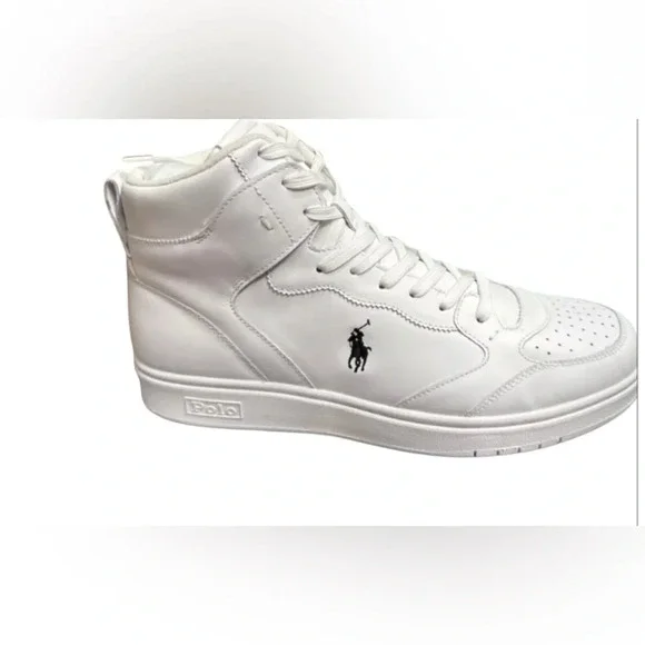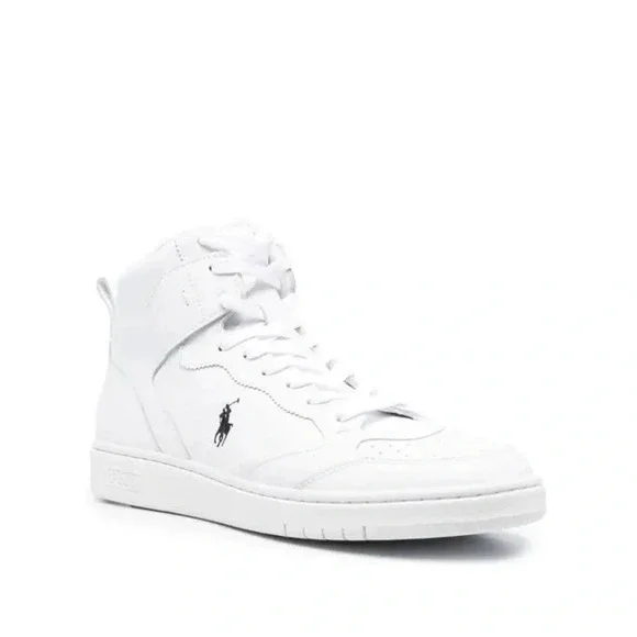 POLO RALPH Lauren CRT High Top Sneakers size 13D Leather White NWOB POLO RALPH Lauren CRT High Top Sneakers size 13D Leather White These are new but are display model may need to be wiped down NWOB Only worn inside store PRODUCT DETAILS white calf leather embroidered logo to the side panelled design perforated toebox ankle-length front lace-up fastening pull-tab at the heel flat rubber sole