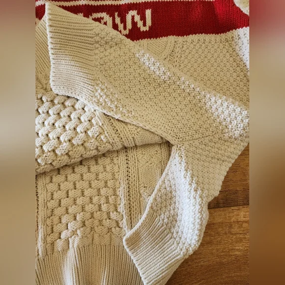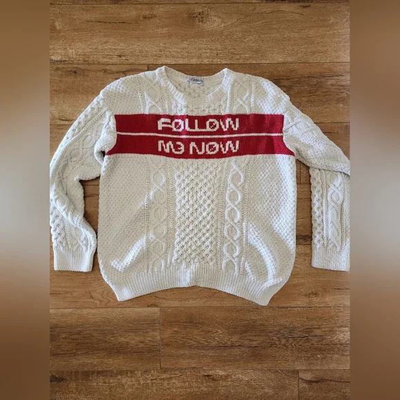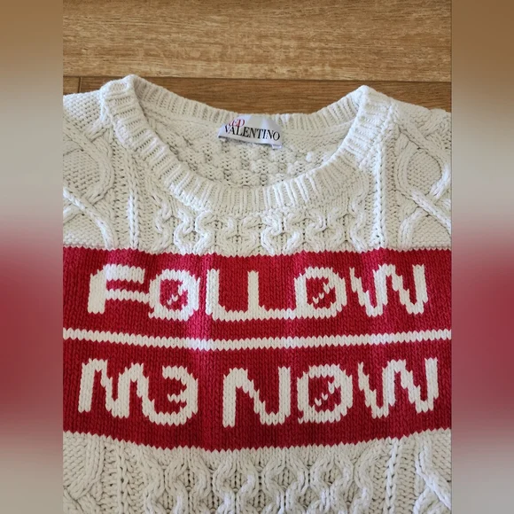 RARE! Valentino Red ITALY MADE Women’s Sweater, Sz XL 100% Cotton FOLLOW ME NOWRelaxed and laid down pit to pit 21in, length 23in.This Valentino sweater is a rare find, made in Italy with 100% cotton. The sweater features a beautiful cable-knit design with long sleeves and a crew neckline. The off-white and red color combination and the 'Follow me now' accent make it a unique piece that would be perfect for any fashionista.The sweater is in a size XL and has a regular fit, making it suitable for all body types. This designer piece is perfect for all seasons and is breathable, ensuring that you stay comfortable at all times. Don't miss out on this rare Valentino women's sweater.