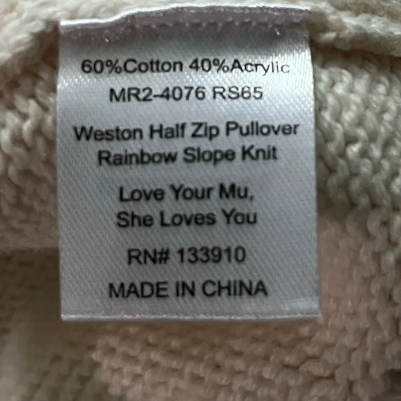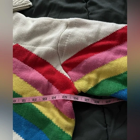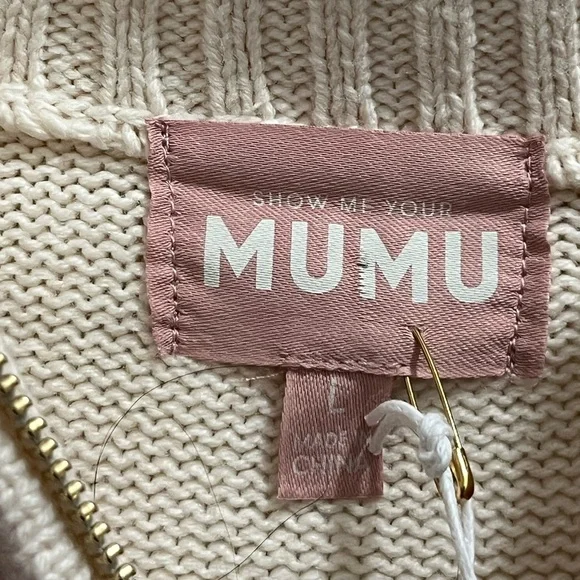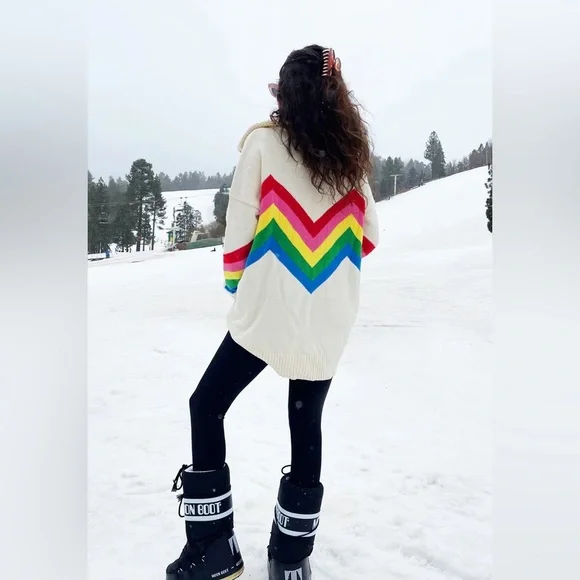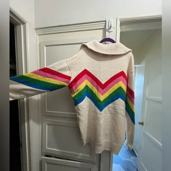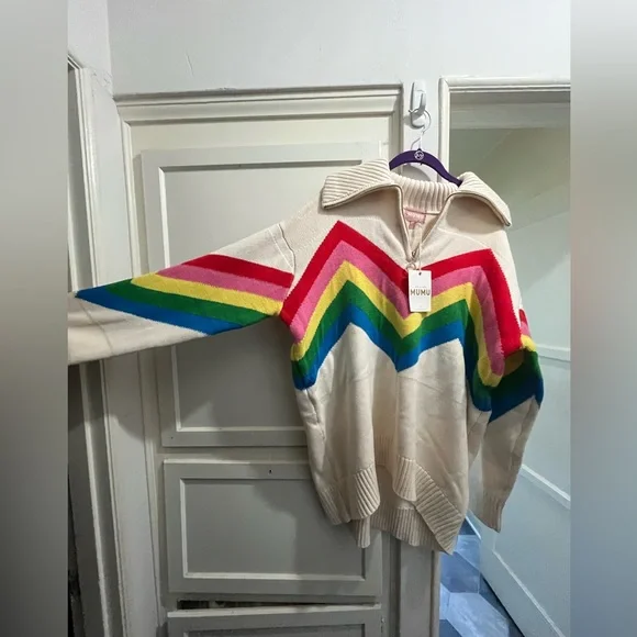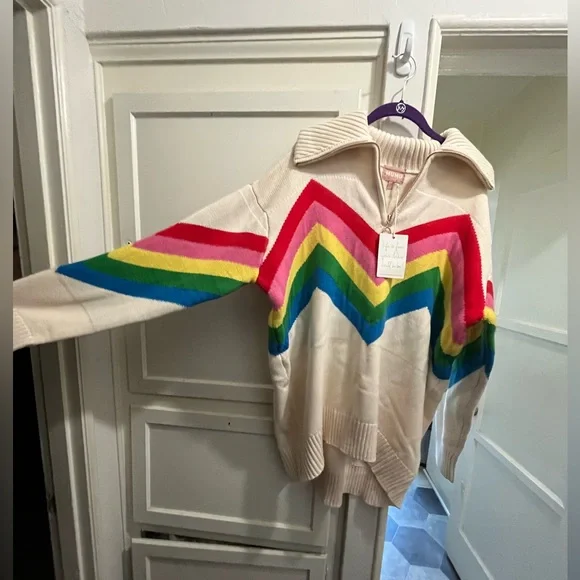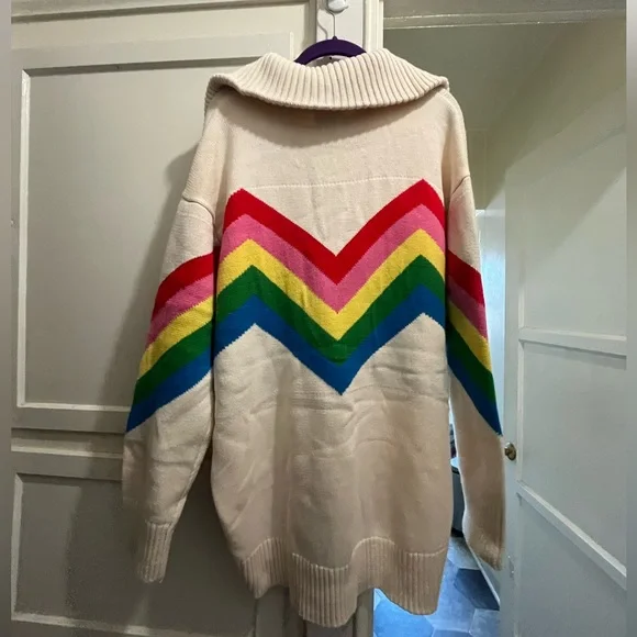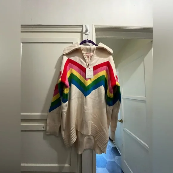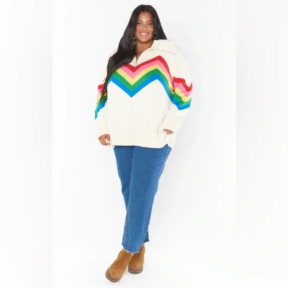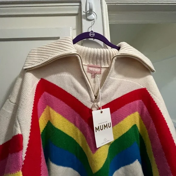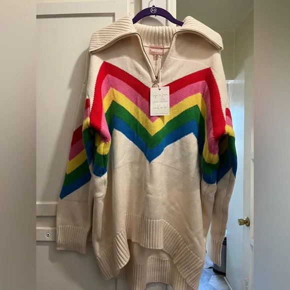 Super cute brand new Show Me your mumu Westin half zip pullover size large/ rainbow pullover. Take on the slopes in this cozy oversized pullover! This sweater features a front zip closure and five tone knit chevron. Throw this on for your next ski trip and you'll stay warm and toasty!Approx flat lay measurements are as follows- Bust- 26”Hem is hi low so see in pics Product Details*60% Cotton, 40% Acrylic*Quarter zipper*hi low hem *ImportedBoxJune25-2