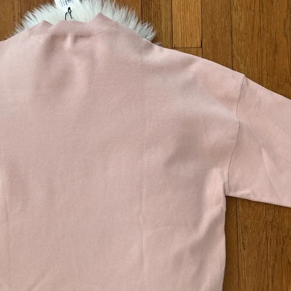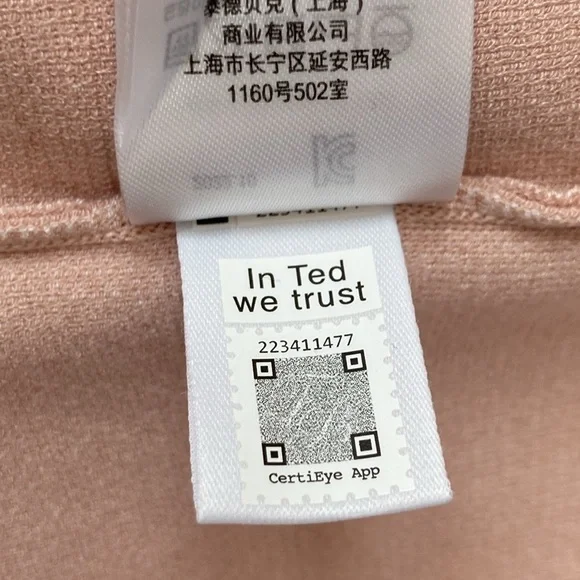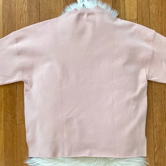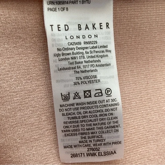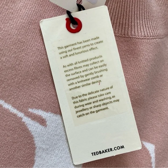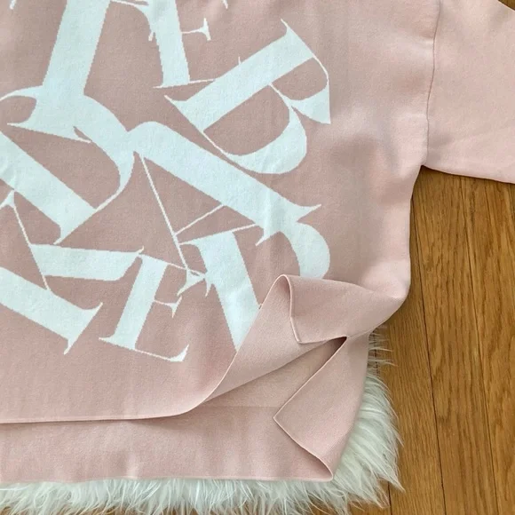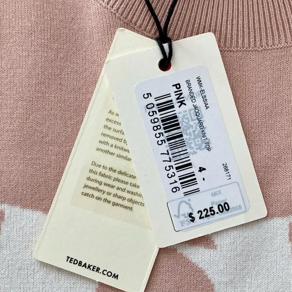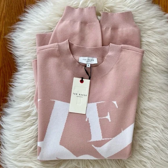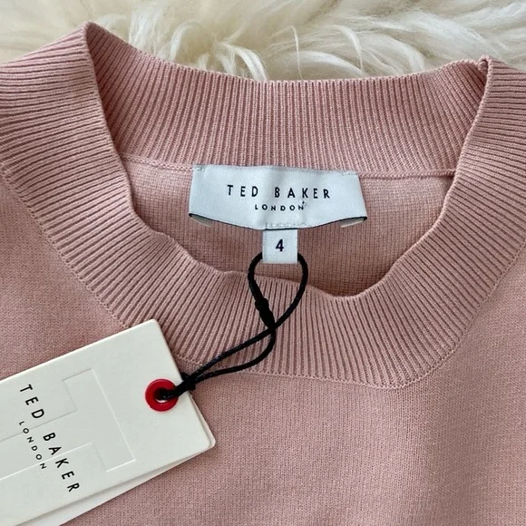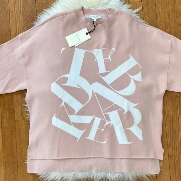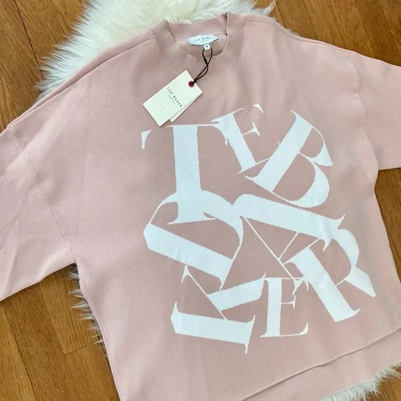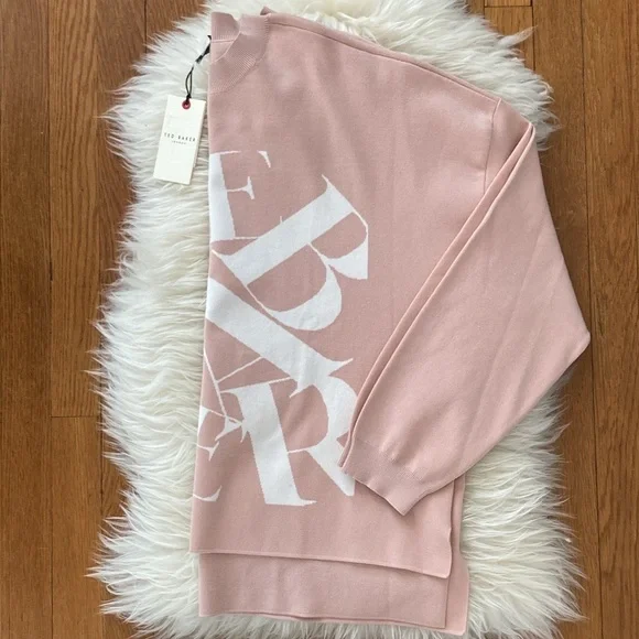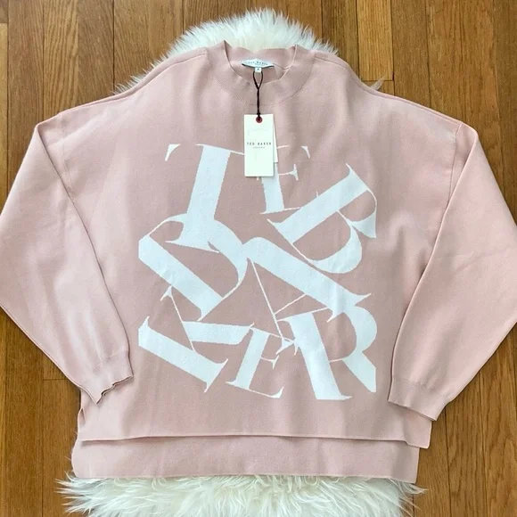 New with Tags Ted Baker 4 = US Size Large Jumbled Logo Front Oversized Fit Dropped Shoulder Crewneck Ribbed Collar & Cuffs Long Sleeves Side Slits Slightly Longer Back Length Fabric provides stretch. Size: Large Under Arms: 24” across, unstretched Waist: 23” across, unstretched Length: 24” front, 26” back70% Viscose/30% Polyester Machine Wash Cold