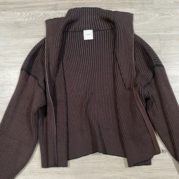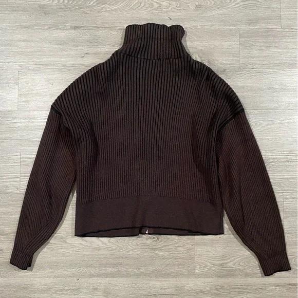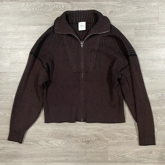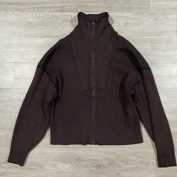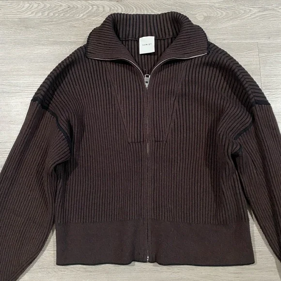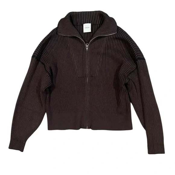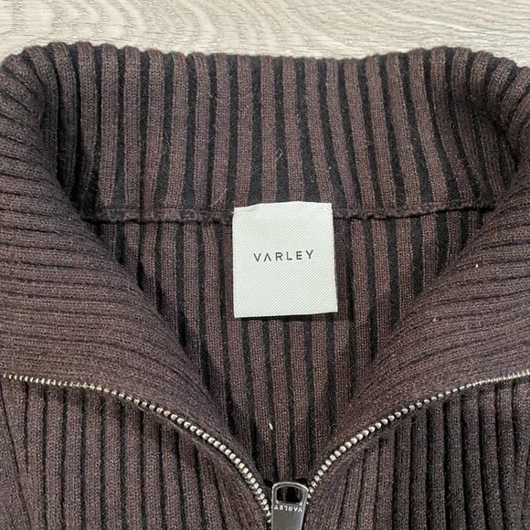Excellent condition brown ribbed full zip sweater size medium Clean-cut and superbly soft," Varley's 'Carmen' cardigan is equally perfect for layering and lounging. It's rib-knitted to hold the slouchy shape and has a zip so you can adjust the way the collar folds.Fits true to size, take your normal size Designed for a slightly loose fit Mid-weight knitBrown ribbed-knit Zip fastening through front 44% viscose, 28% nylon, 28% polyester Machine wash