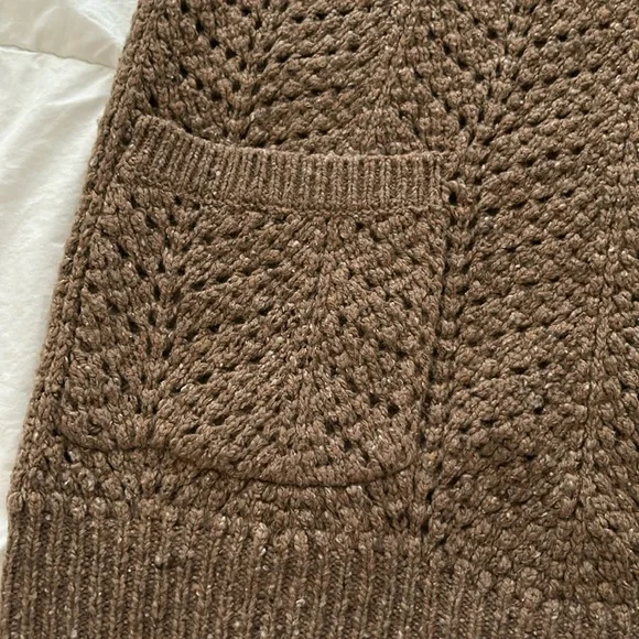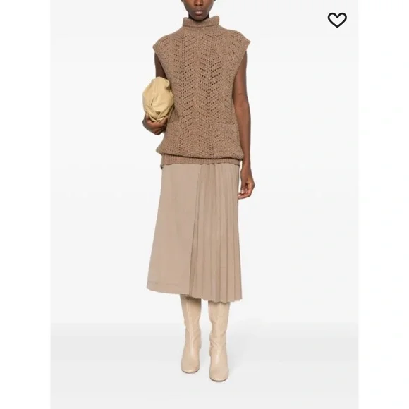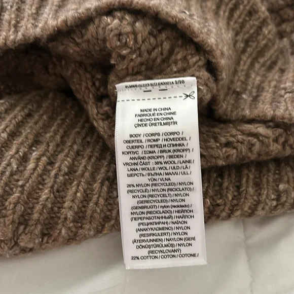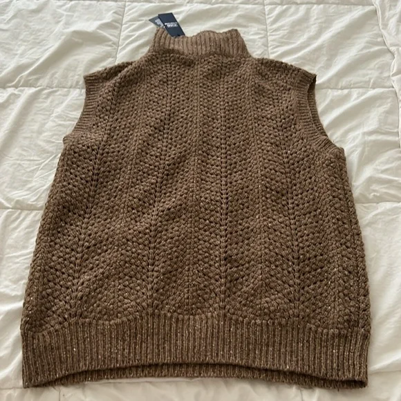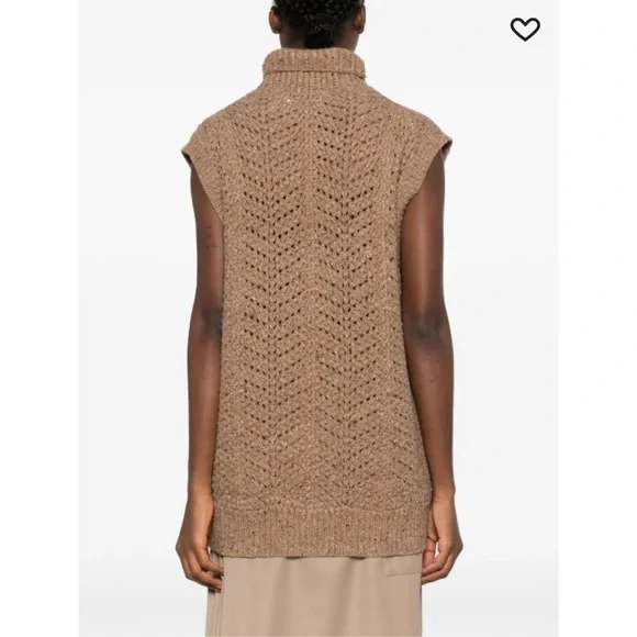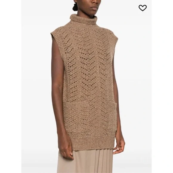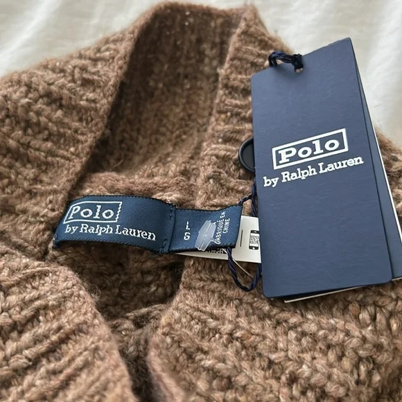 NWT Polo RL Highlights:camel brown, wool blend, open knit, roll neck, sleevelesstwo side patch pockets, ribbed cuffs and hemCompositionWool 38%, Recycled Nylon 26%, Cotton 22%, Viscose 12%, Cashmere 2%Washing instructionsHand WashFitting informationDesigned to be unstructured, offering a loose fit throughoutMade with a midweight knit, this piece offers some stretchThis piece fits true to size – take your usual size