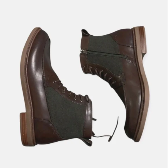 NEW Vince Camuto Mens Bendmore Brown Leather Lace Up Boots Color Bourbon Size 10.5New no box. Stylish blend of Textile & Leather. Beautiful & durable men's brown classic Lace up, zipper side boots. Perfect for any occasion Formal or Casual.For a casual look thats both refined and rugged, choose these stylish Bendmore boots from Vince Camuto.Product Features1" heelShaft height: 5-3/5"Round apron toeLace upPull tab at heelLeather, polyester upper; polyester lining; rubber soleImported