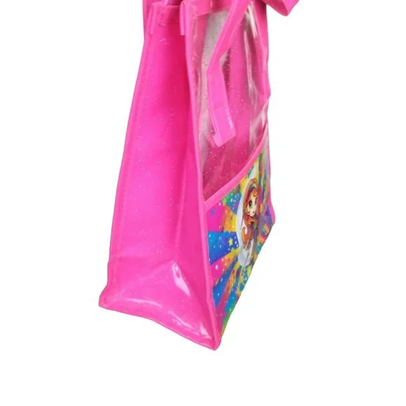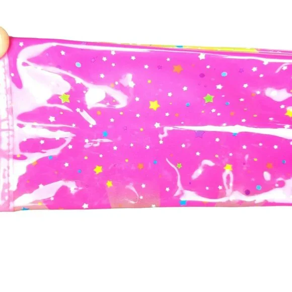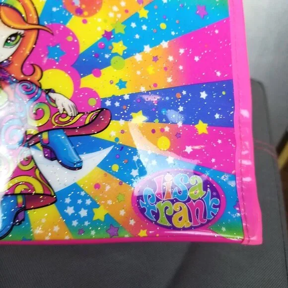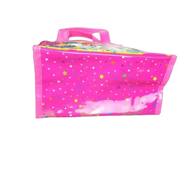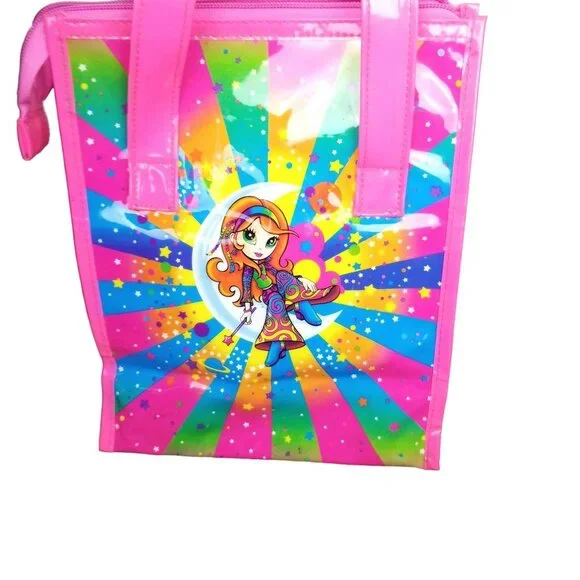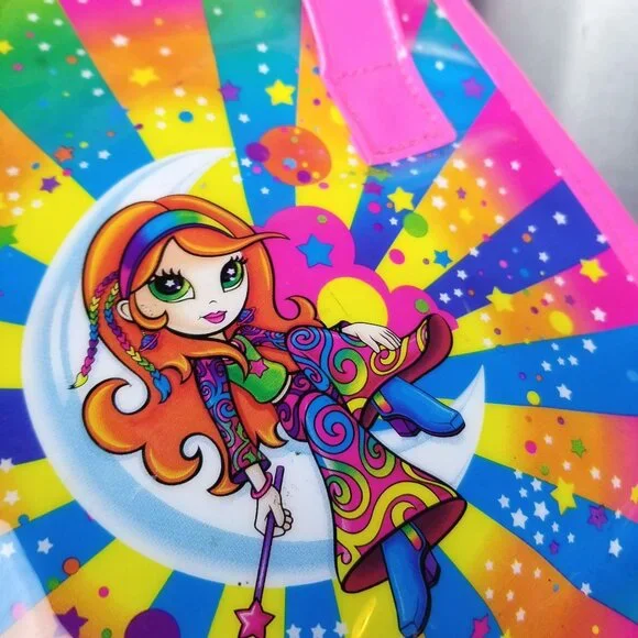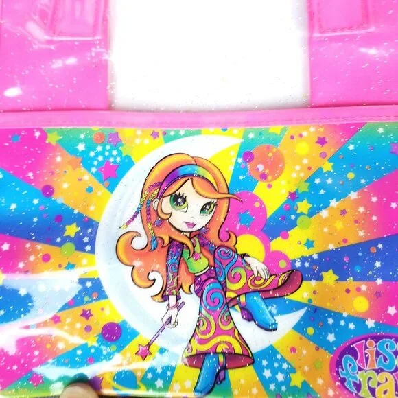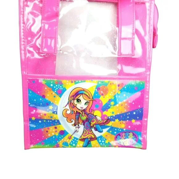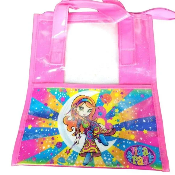 10x8.5lisa Frank vintage vinyl plastic like bag lunch box school supplies. red headed 70s lisa Frank bohemian rainbow hippie mushroom girl fairy reclines on a crescent moon with stars and clouds background. pink and clear. good condition with handles.glitter. mild imperfections like shown.y2k vintage 90s millenial girly art artistic rainbows neon bright nostalgia collectible rare psychedelic trippy rave festivalCondition: Pre-Owned Good