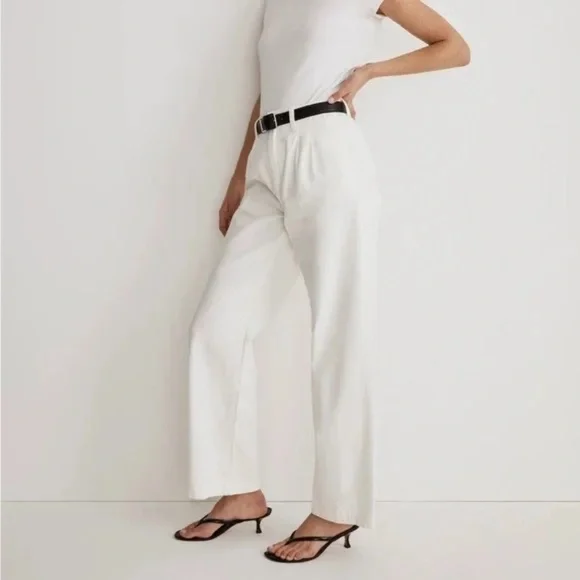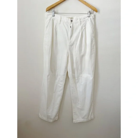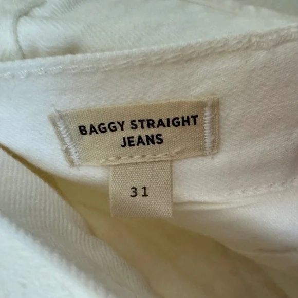 Madewell The Harlow Wide-Leg Baggy Straight Jean in Tile White( Perfect winter white ) Size 31New With Tags -NWTThe cut: a fresh take on our best-selling pants, these pleated baggy jeans are fitted through the high waist with wide legs. The fabric: premium Cone® 100 percent cotton white denim with old-school character, no stretch and zero show-through. Perfect white shade. 100% cotton.Do Well: By buying cotton products from Madewell, you're supporting our investment in Better Cotton's mission to help cotton communities survive and thrive while protecting and restoring the environment. This product is sourced through a system of mass balance and therefore may not contain Better Cotton. Machine wash. Import. NK 798 Harlow ( originally called Baggy Straight Jean)approx. measurements : waist 17" 12 high rise, 20" wide-leg opening, 30”inseam.