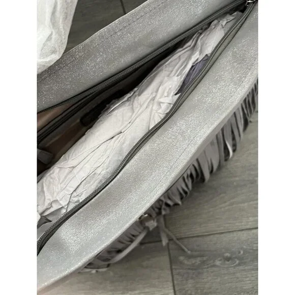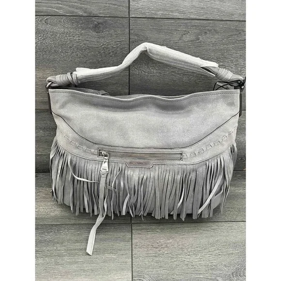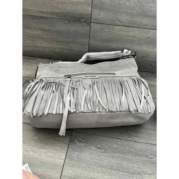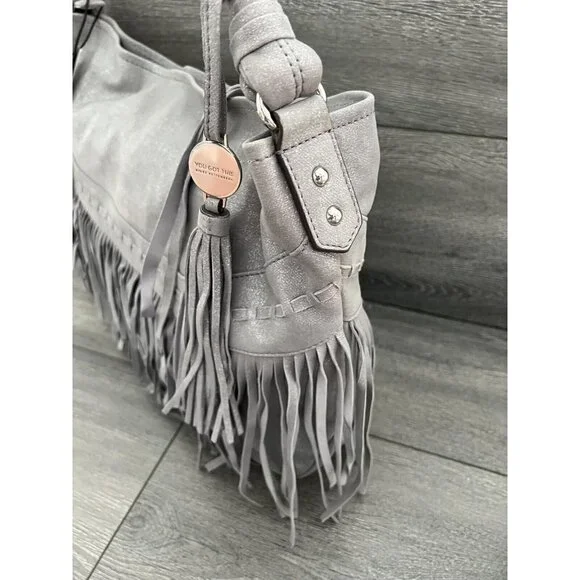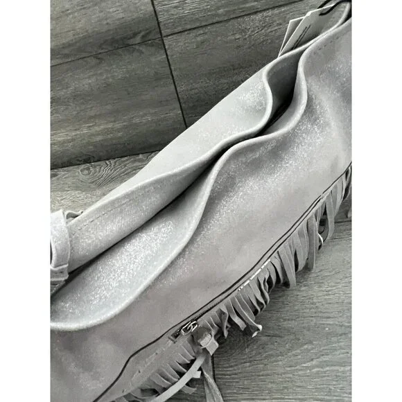 Aimee Kestenberg The Lulu Leather Hobo with Fringe CrystalMetallic,BagFrom Aimee Kestenberg.• Style: The Lulu• Main zip closure, exterior zip pocket, fringe/braiding detail, top handle• Two zip pockets, slip pocket• Measures approximately 18"W x 3.25"D x 11.5"H with a 4" handle drop; weighs 1.9 lbs• Body 100% leather; lining 100% polyester• Imported