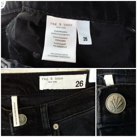 Rag & Bone Peyton Jeans Womens 26 Black Midrise Ankle Boot Cut Raw Hem GrungeSlightly pre-owned condition Rag & Bone Peyton Jeans Womens 26 Black Midrise Ankle Boot Cut Raw Hem Grunge. Cotton Blend. Style: WDD22H2928CBHL, Color: HighlandNotes: Hem has been cut to 27 in inseam. View photos.Size/Measurements:Marked Size: 26Actual waist measures: 28Front Rise: 10Inseam: 27Outseam: 37Leg Opening: 17***I would recommend comparing sizes to a similar garment from your closet to determine if the size fits you.Rag&Bone, Jeans, Grunge, Rock, RawHem, Punk, Indie, Festival