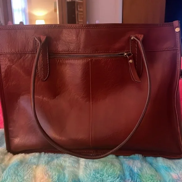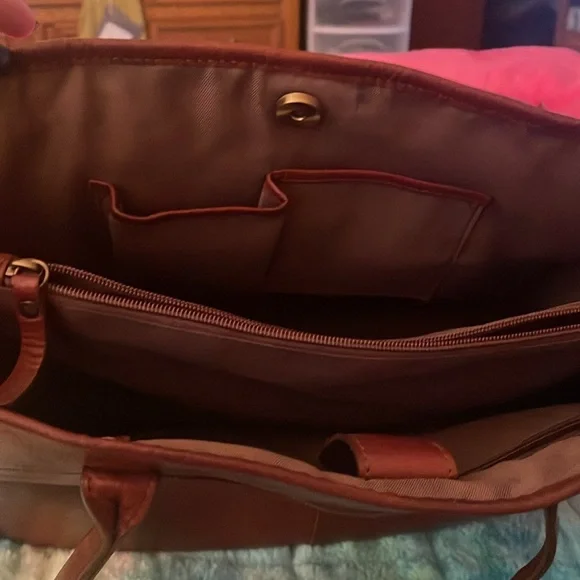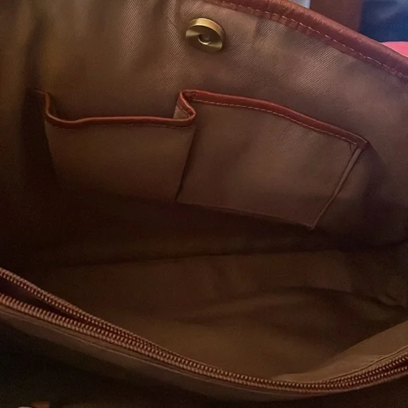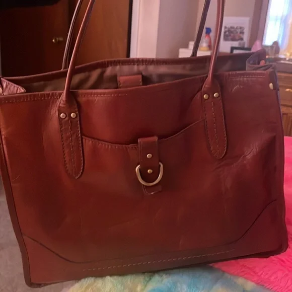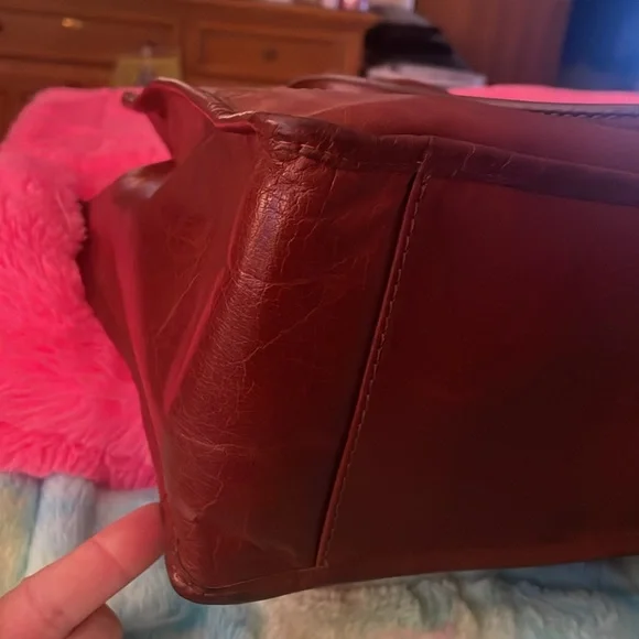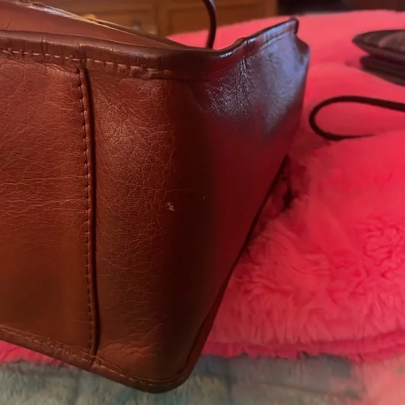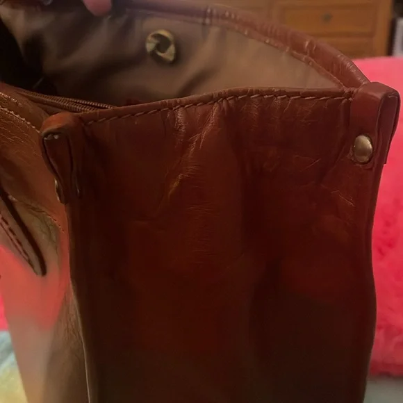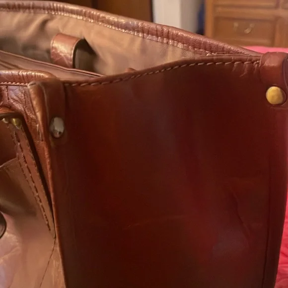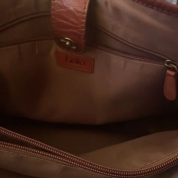 Super, super gorgeous brown authentic BOLO Tote Bag. Snap closure on top. Large middle zipper compartment, 2 slip pockets inside with 1 inside zipper pocket. Outside buckle accent pocket and 1 outside zipper pocket. Super roomy with spotless interior. Not a mark on this bag except one small scuff on corner. Beautiful distressed leather smelling yummy! Large size measuring 15”L 11” H 5.5” D 10” handle drop.