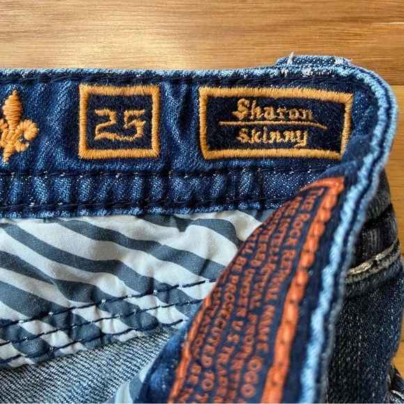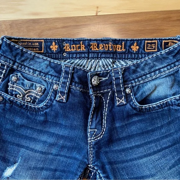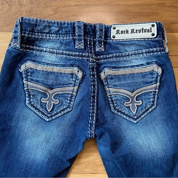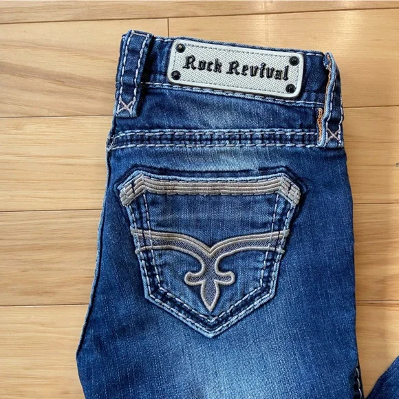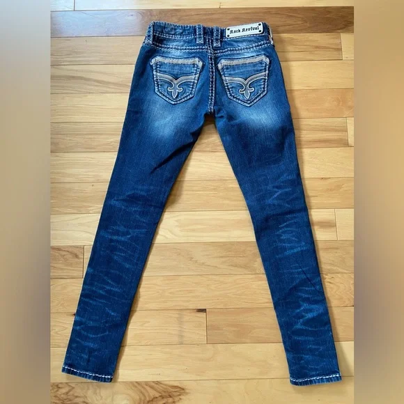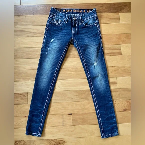 Rock Revival Sharon Skinny Jeans Womens 25 Reg Low Rise Distressed Dark Wash DenimExcellent pre-owned condition without any visible flawsWomen's Rock Revival Sharon Skinny Low Rise Embellished Denim JeansSize: 25 Regular (measures 13.5" across waistband and 30" inseam)Low Rise at 7.5" and 10" leg openingDetails: Dark wash distressed denim jeans with heavy silver metallic stitching throughout. 5 pocket design with heavy embroidery on back and coin pockets. White logo patch on back waistband. Zipper fly with fleur-de-lis button closure.