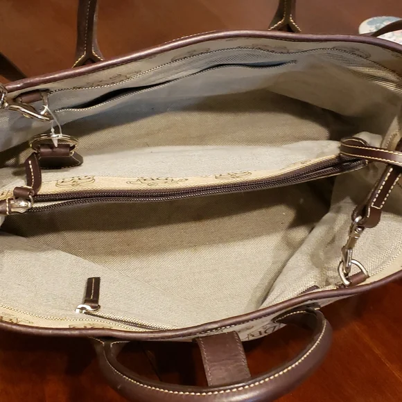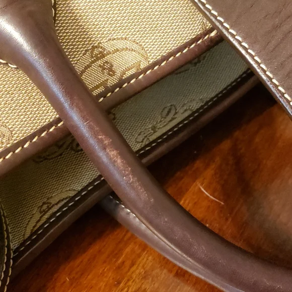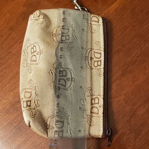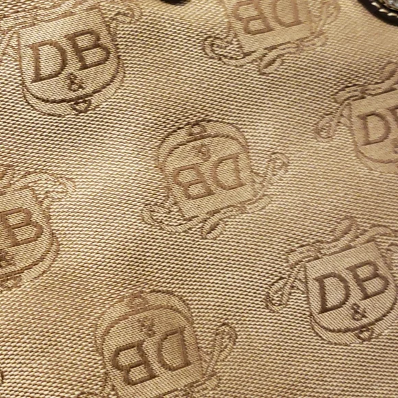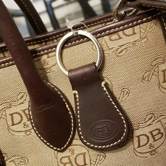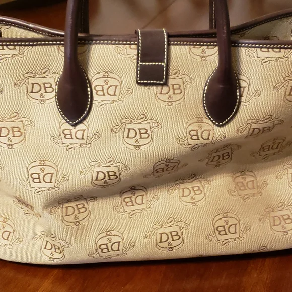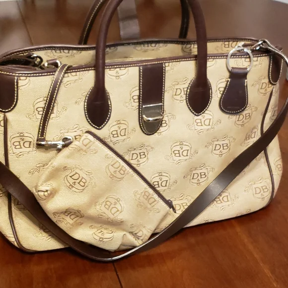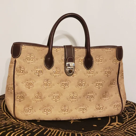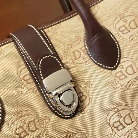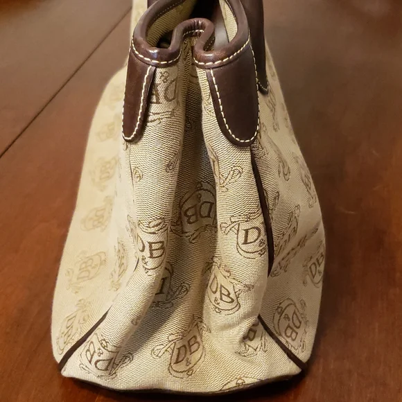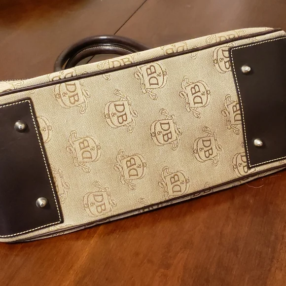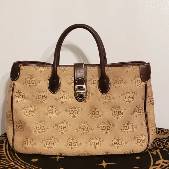 This adorable handbag shows miniml signs of wear and is in near perfect condition withonly minor discoloration on the interior. No known exterior flaws with the exception of handle scuff imaged. It is made of canvas with leather trim and handles and has a buckle closure. Has original detachable extension strap and DB logo leather Keychain. There is also an attached coin purse that will help you keep your loose change, money, or other items at easy reach. It is approximately 14.5" across and 9.5" tall. The sides are approximately 5" across and the bottom is 6" across. If you like Dooney and Bourke, then you are sure to love this classy handbag. Questions? Leave a comment below!