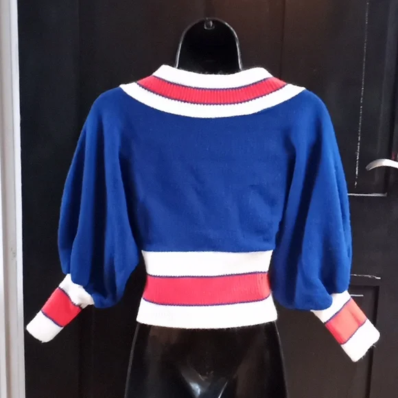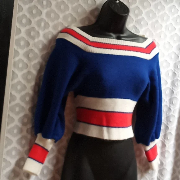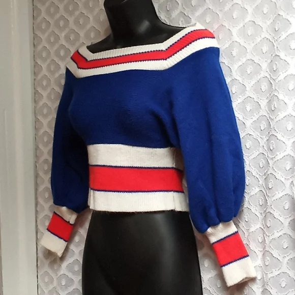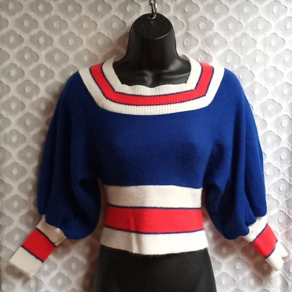 Super Cute c1970s Vintage Red White & Blue Color Block 3/4 Balloon Sleeve Cropped Boat / Square Neck Knit Sweater.. I've not located a material &/or sz tag but I'm fairly certain it's an acrylic cotton blend or maybe just acrylic. I purchased this along w several other c'50s - '70s pcs from the same High End Estate and the majority of the others are a sz small &/or '34'.. I've listed this (as well as the others) as 'Petite'/Sm due to vtg sizing, please be sure to refer to measurements and ask any questions prior to purchase. The only notable flaws are shown in pics 13&14, otherwise Fantastic Vintage Condition!(Other Listing Styles) Loose slouchy oversized Poofy puff balloon rouched fitted mock neck turtleneck braid fringe tassel waffle popcorn polka-dot chunky tight form fittingstriped cozy warm casual dressy work career office party fest festival wear pull-over collared embellished embroidered sequins beaded lace crochet trim midriff camo cashmere Merino mohair angora wool blend open off cold tie front back ribbed cut-out cable Paisley checkered cerulean plaid polka dot duster ribbed printed patterned striped RubyChevron long duster short croppedsolid floral flower cheetah leopard animal color block lilac lavender baby periwinkle soft powder turquoise teal blue mint lime navy neon pastel burgundy ruby red seafoam ultra bright neutral forest green vintage mid century modern formal casual contemporary hippie 40s 50s 60s 70s 80s 90s '00 Y2K striped fuzzy knit